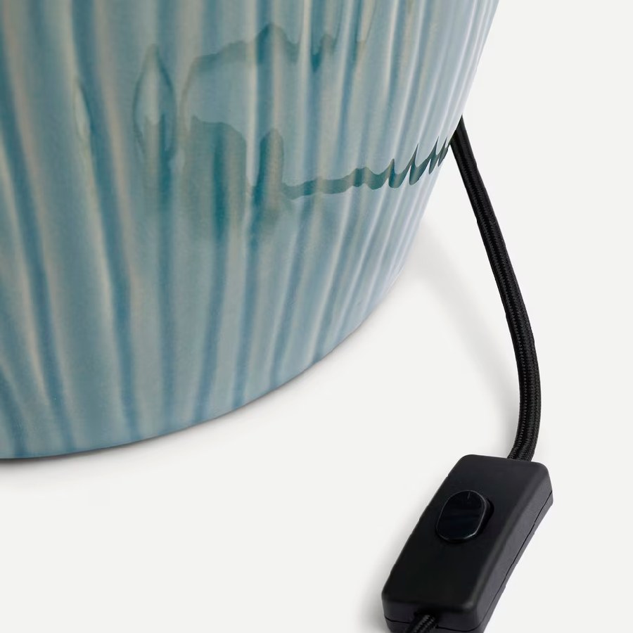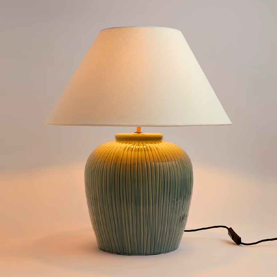 Elegante lámpara de mesa con una gran base de cerámica en color verde y pantalla textil en color crema.