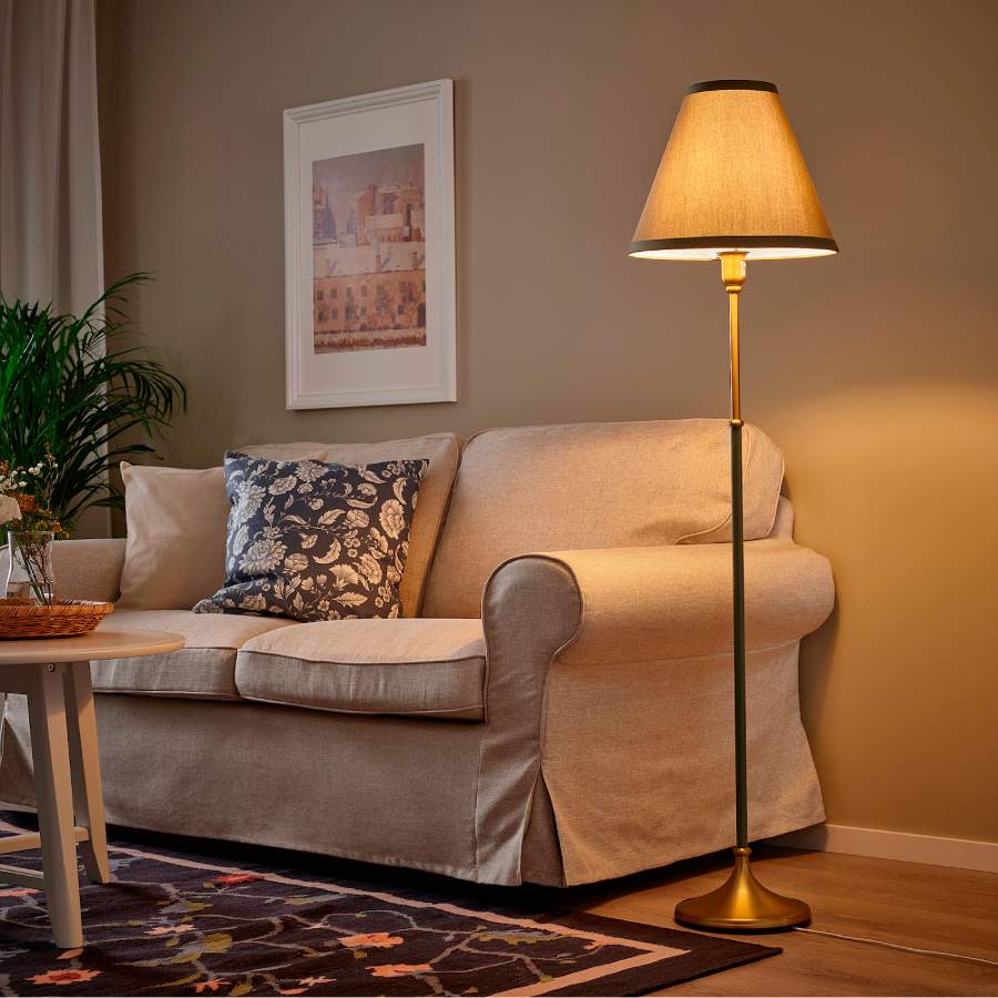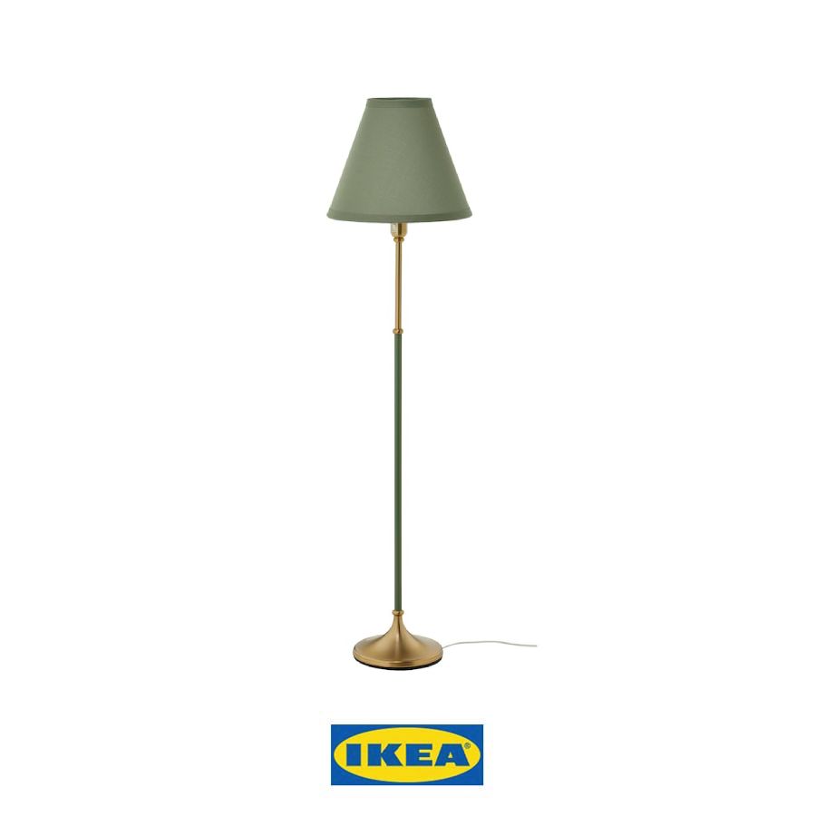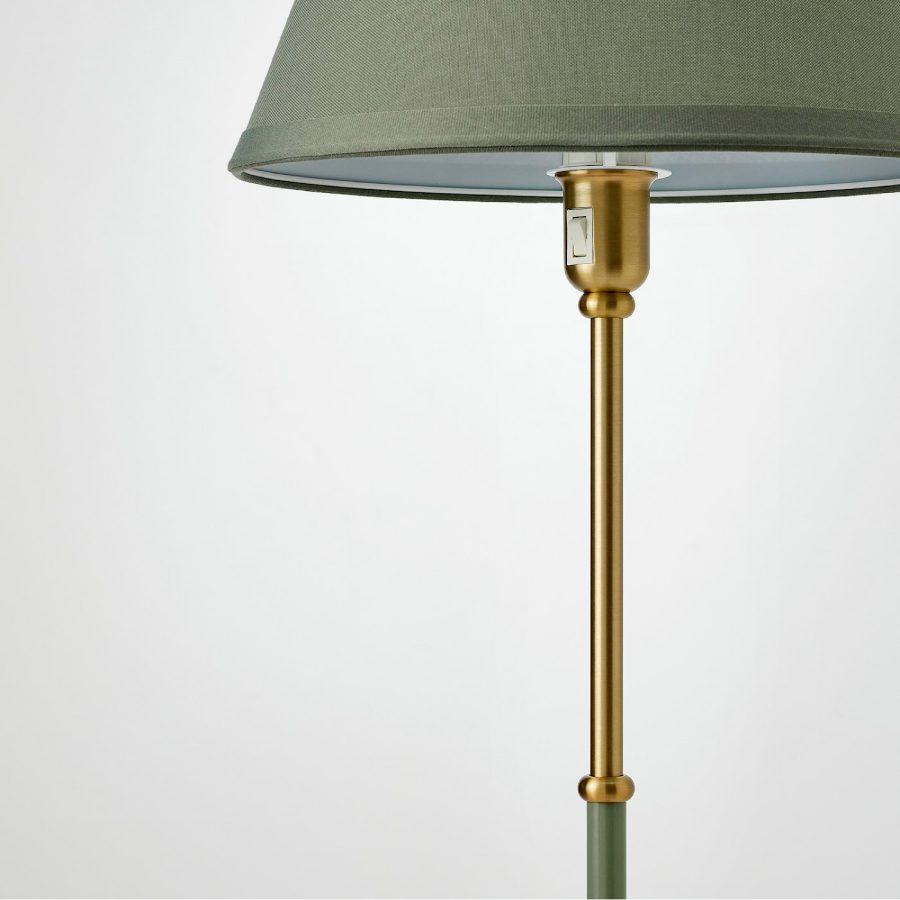 Lámpara de pie elegante con pie de latón dorado y pantalla en un color gris verdoso. Un diseño intemporal con un toque clásico. Perfecta para tu rincón de lectura.