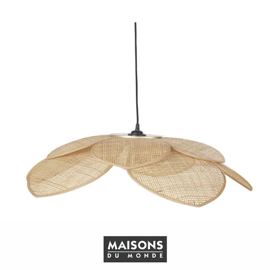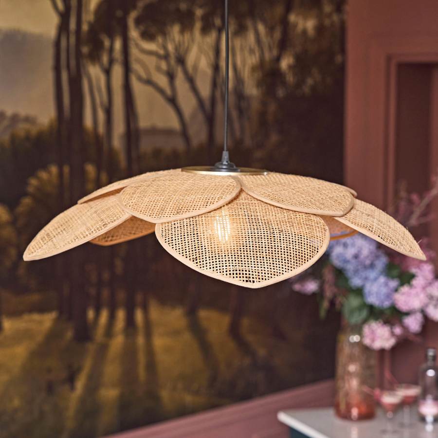 Bonita lámpara de techo con diseño de forma de flor fabricada con ratán trenzado.