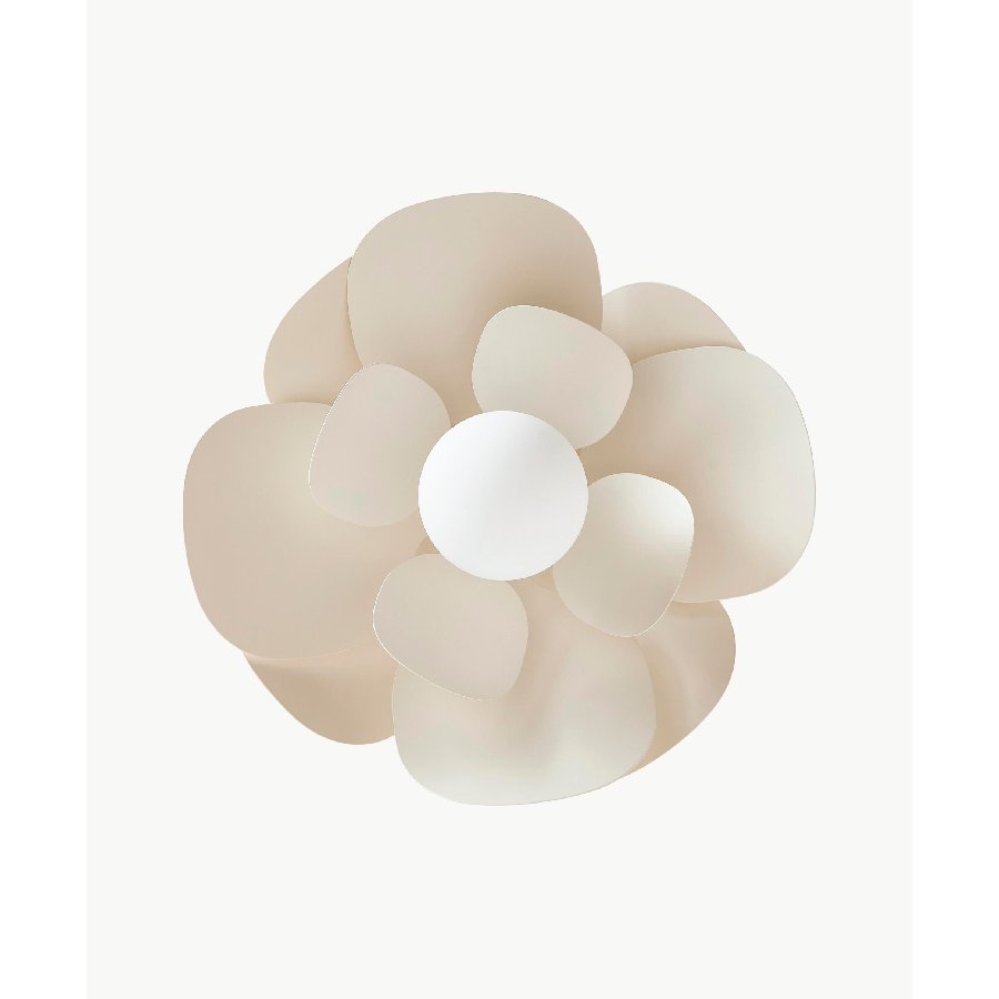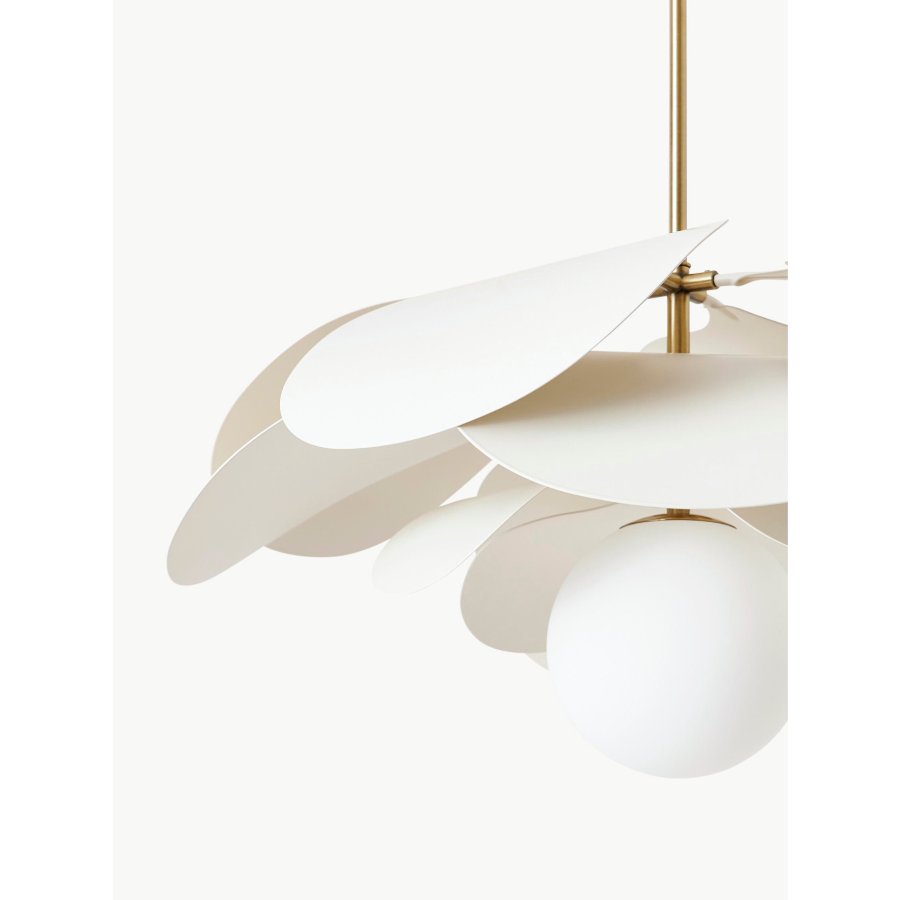 Plafón de diseño con estructura de metal recubierto dorado y pantalla de metal y vidrio blanco.