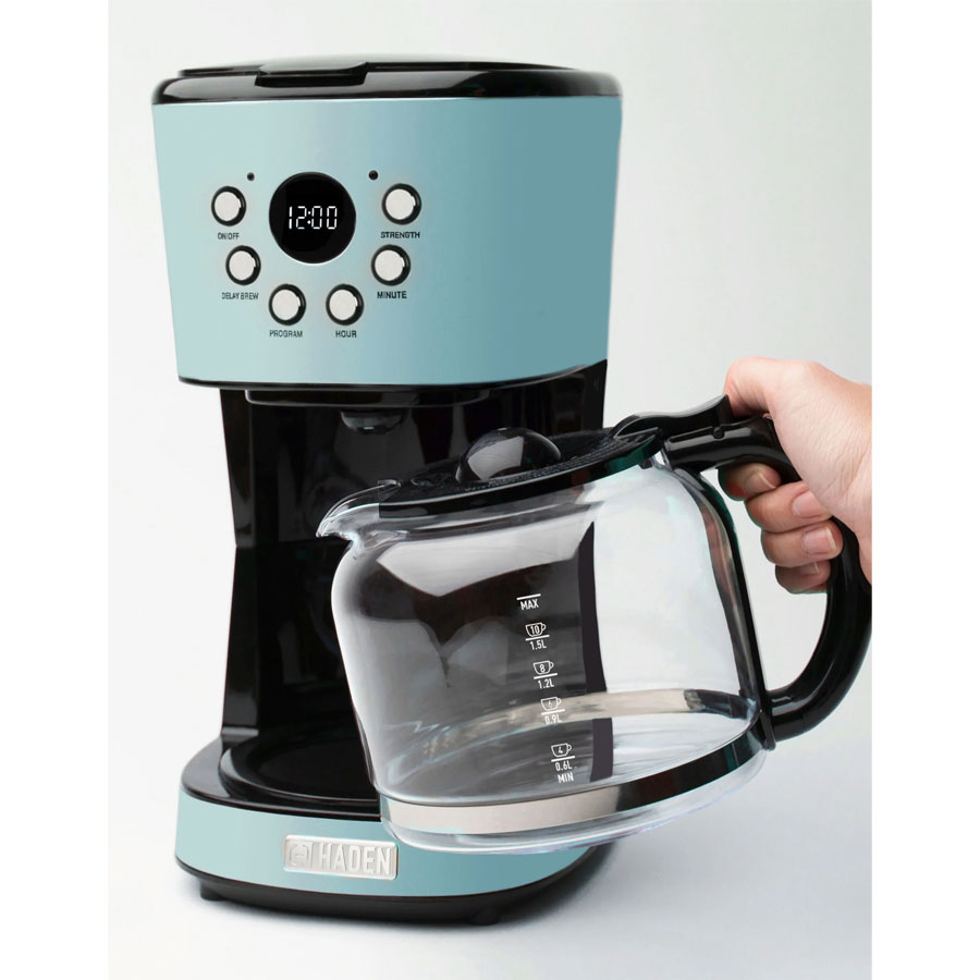 Coqueta cafetera de jarra por goteo de color turquesa. Con pantalla LCD y seis funciones: encendido/apagado, preparación diferida, programación, hora, minuto y ajustes de intensidad.