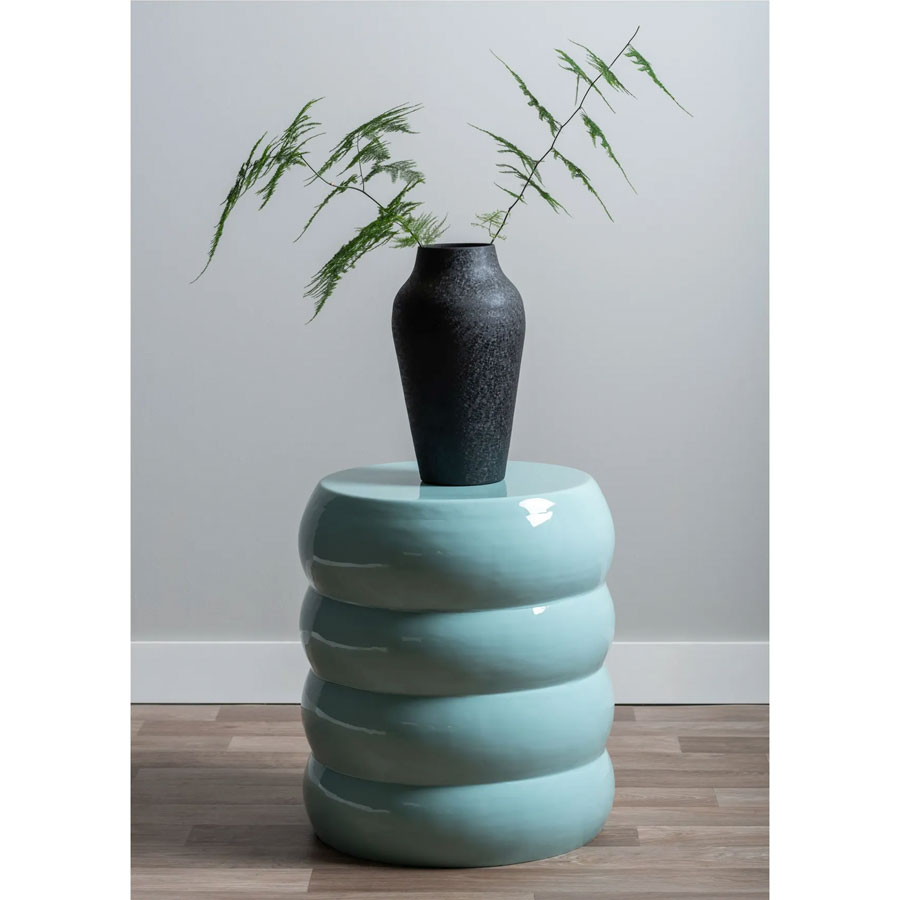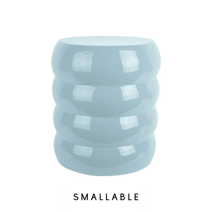 Mesa auxiliar o taburete de color azul con un original diseño de formas curvas. Fabricado en India.