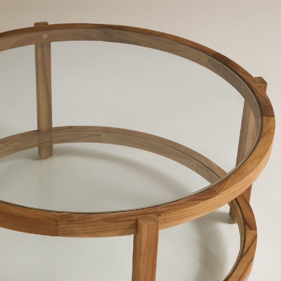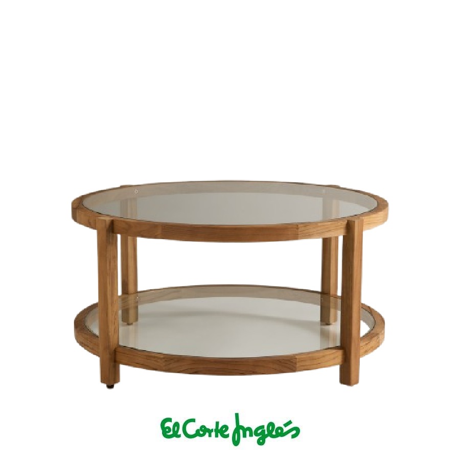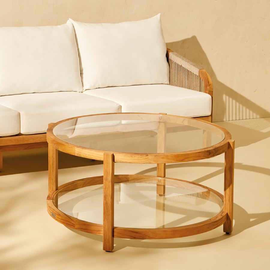 Preciosa mesa de centro redonda fabricada en madera de teca con dos baldas con tablero encastrado de cristal templado.