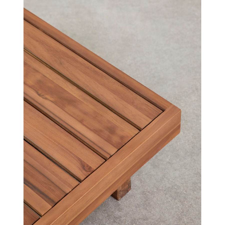 Una versátil mesa baja de centro cuadrada fabricada en madera de acacia. Perfecta para usar en tus espacios exteriores aportando un toque elegante.