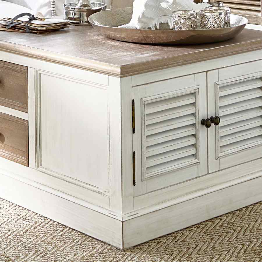Coqueta y práctica mesa de centro cuadrada con diferentes espacios de almacenamiento: cuenta con cuatro cajones y dos puertas. Fabricada en madera maciza y lacada en blanco envejecido. Un diseño de estilo clásico e intemporal con aire de casa de campo. Se entrega totalmente montado.