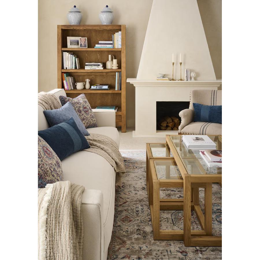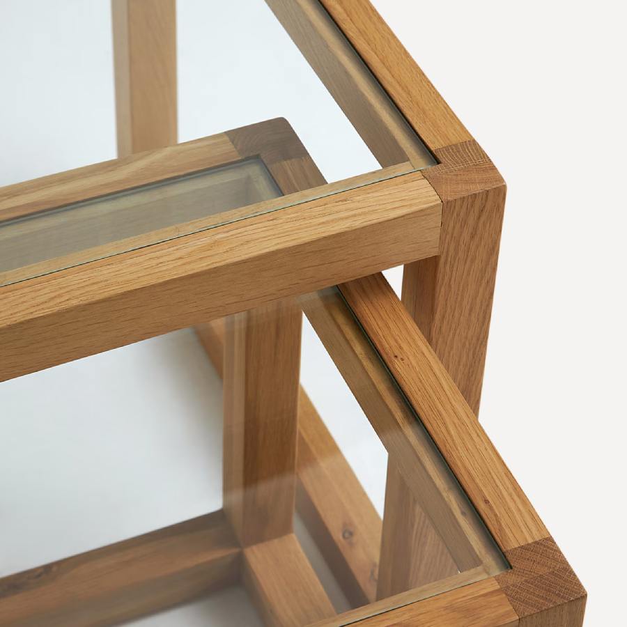 Set de mesas funcional compuesto por una mesa de centro rectangular y 2 mesas auxiliares cuadradas que pueden guardarse debajo de la mesa principal. La estructura está fabricada con madera de roble y la superficie de cristal.
