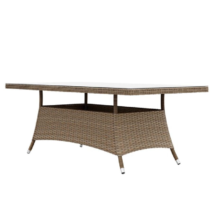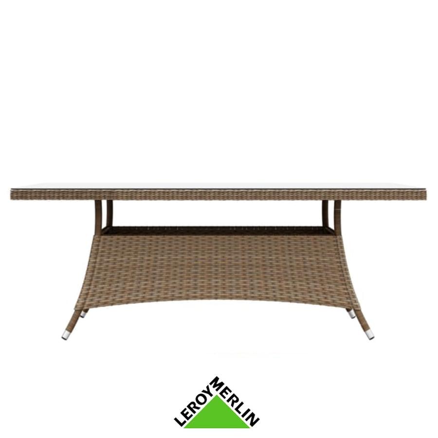 Mesa de comedor de exterior rectangular con estructura de aluminio de color marrón y tablero de vidrio. Gracias a su resistencia a la intemperie es una opción perfecta para tu terraza o jardín.