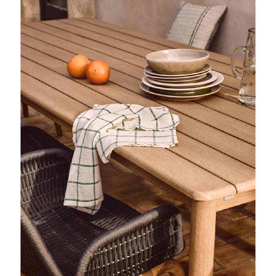 Esta mesa de exterior de madera maciza de acacia con certificación FSC destaca por su presencia robusta y belleza natural. Su amplio tablero realza las vetas únicas de la madera, aportando calidez y autenticidad.
