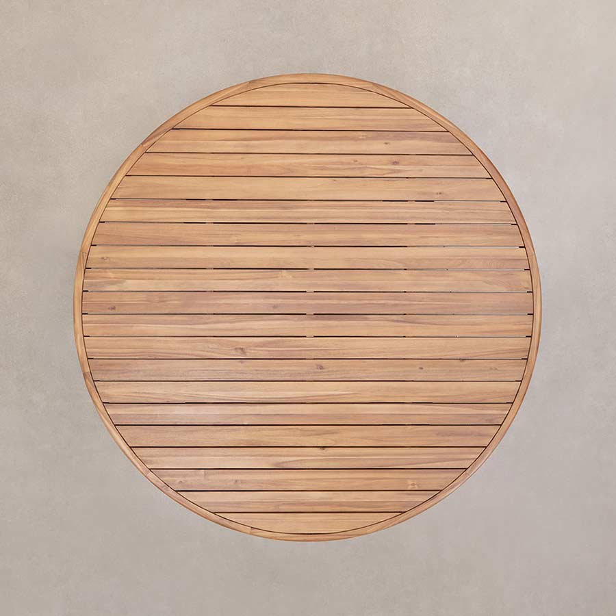 Elegante mesa de jardín redonda de madera de acacia con robustas patas y cuyo tablero muestra un acabado de listones que realza las vetas naturales de la madera.