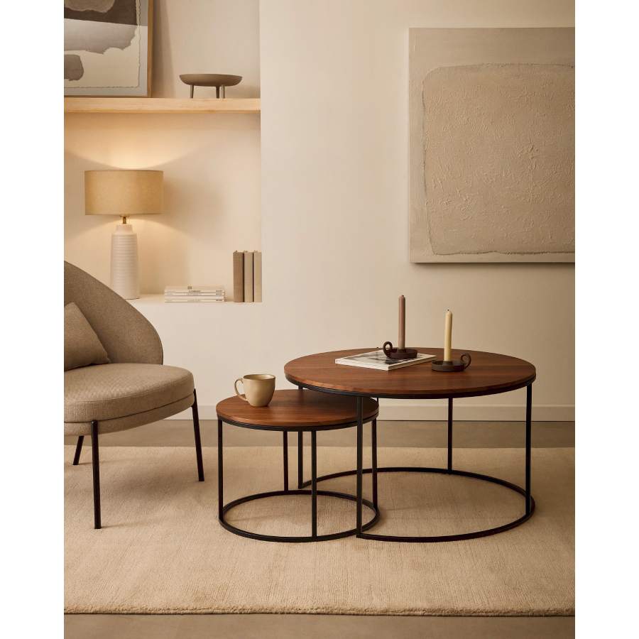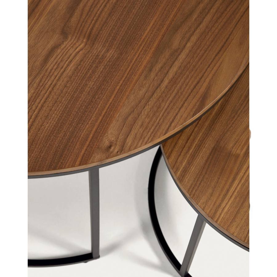 Set de dos mesas auxiliares nido con tablero en forma redonda de chapa de nogal estructura de metal pintado negro.