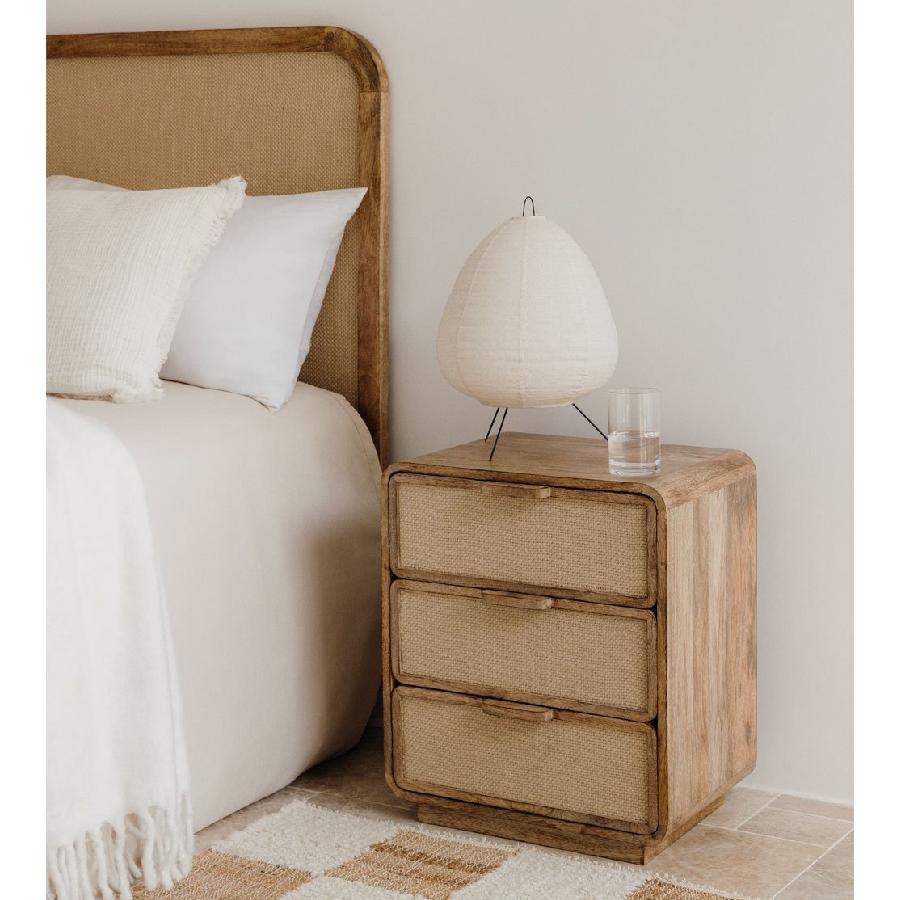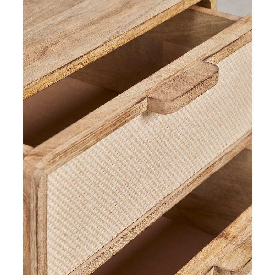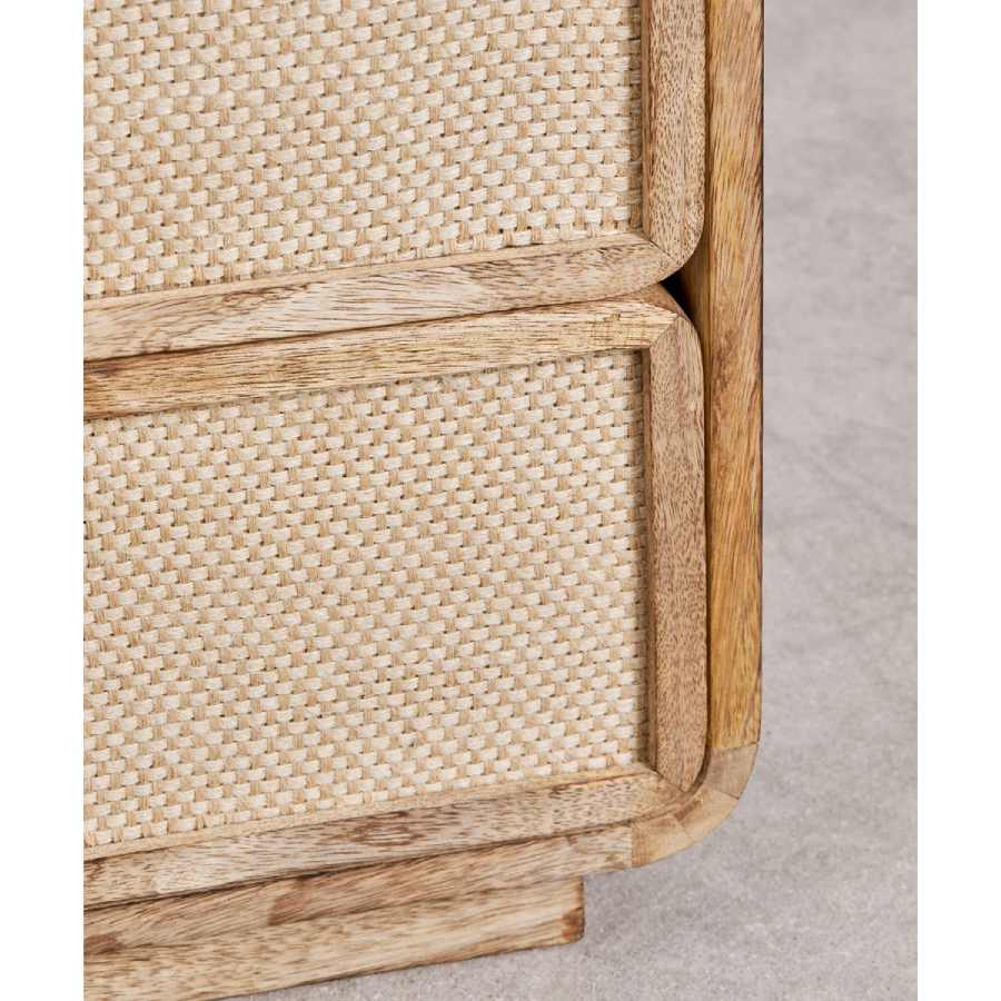 Mesita de noche de estilo rústico con 3 cajones, fabricada con madera de mango con acabado natural mate y yute natural.