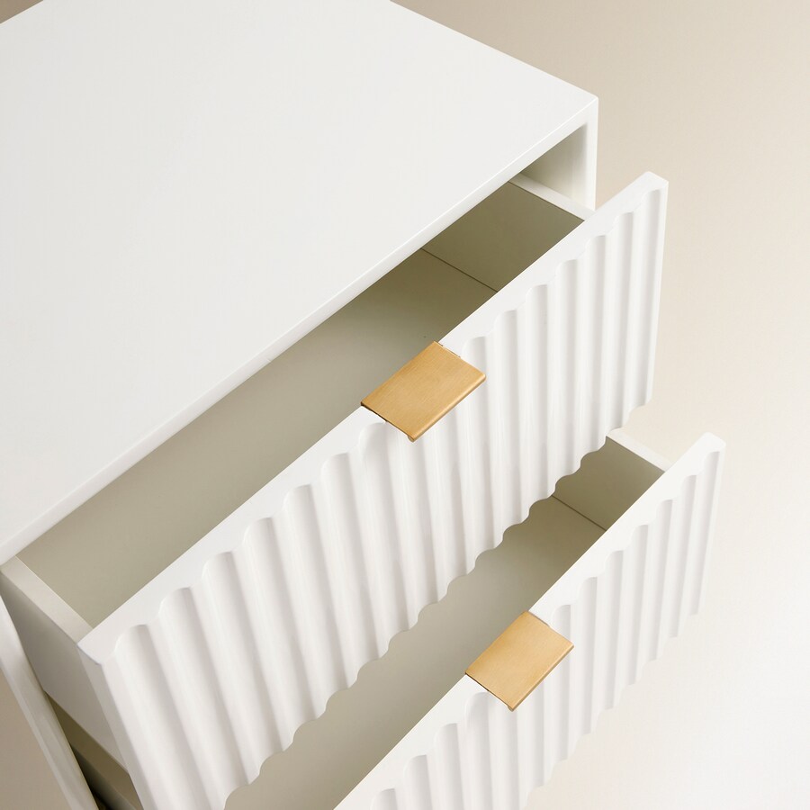 Moderna mesita de noche de MDF lacado en blanco con 2 cajones con cierre suave. Los tiradores y las patas son de metal dorado.
