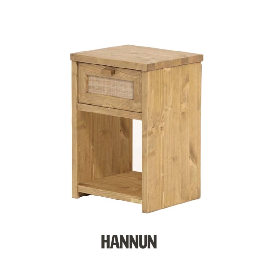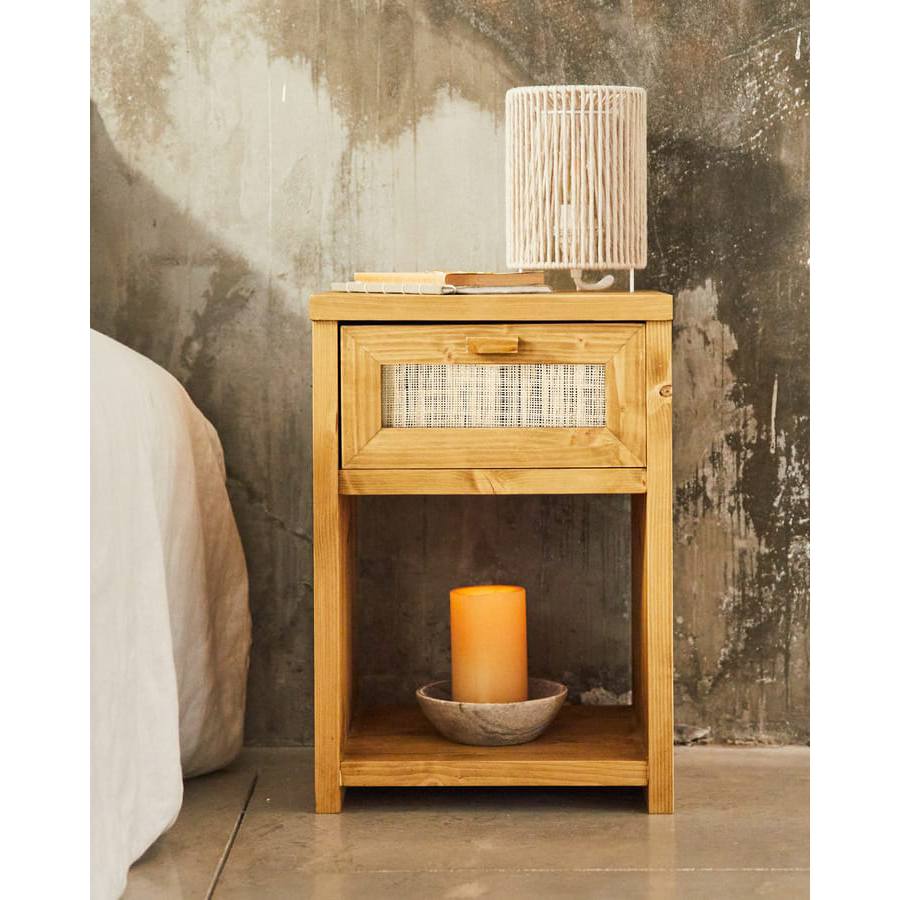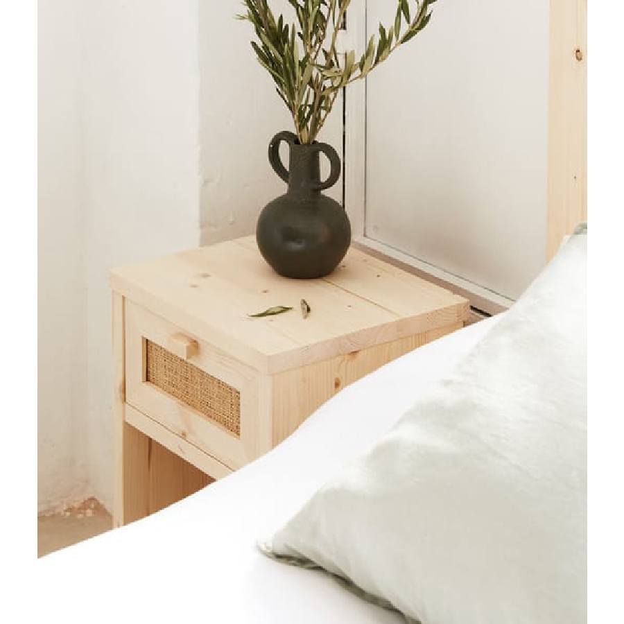 Mesita de noche de madera de abeto y rafia