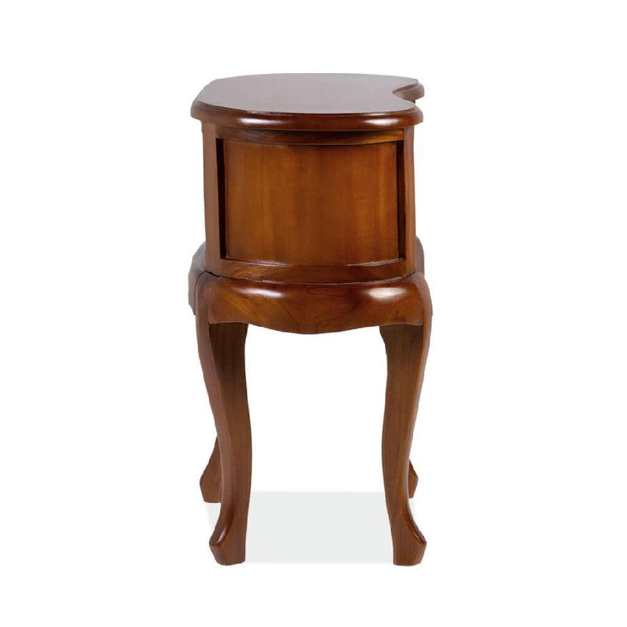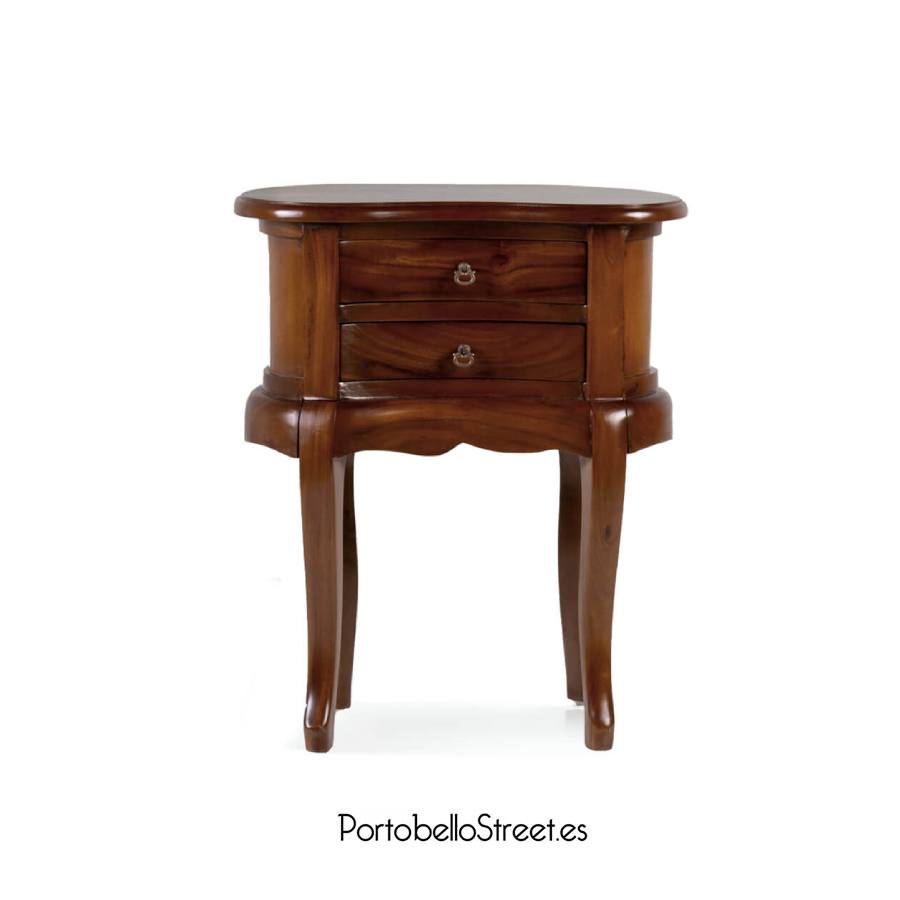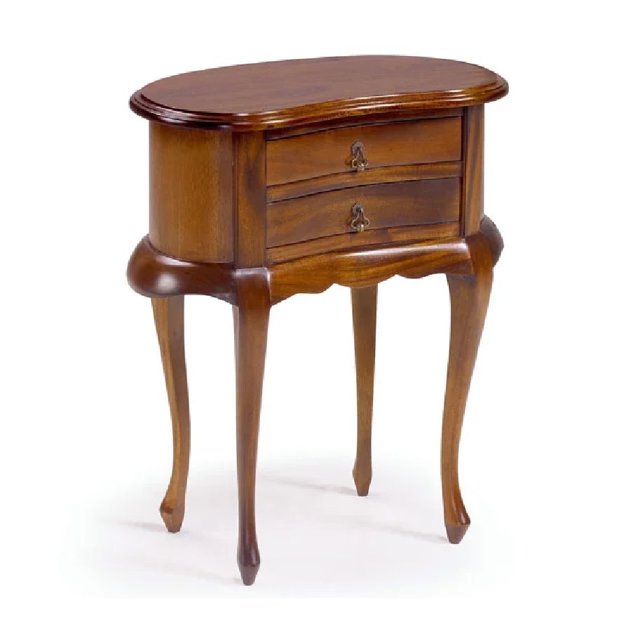 Elegante mesita de noche de estilo vintage con dos cajones, fabricada artesanalmente con madera de caoba y con tiradores de bronce.