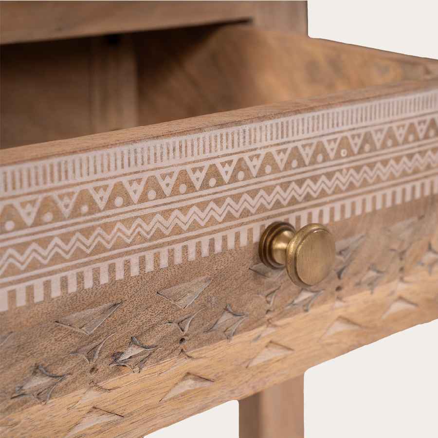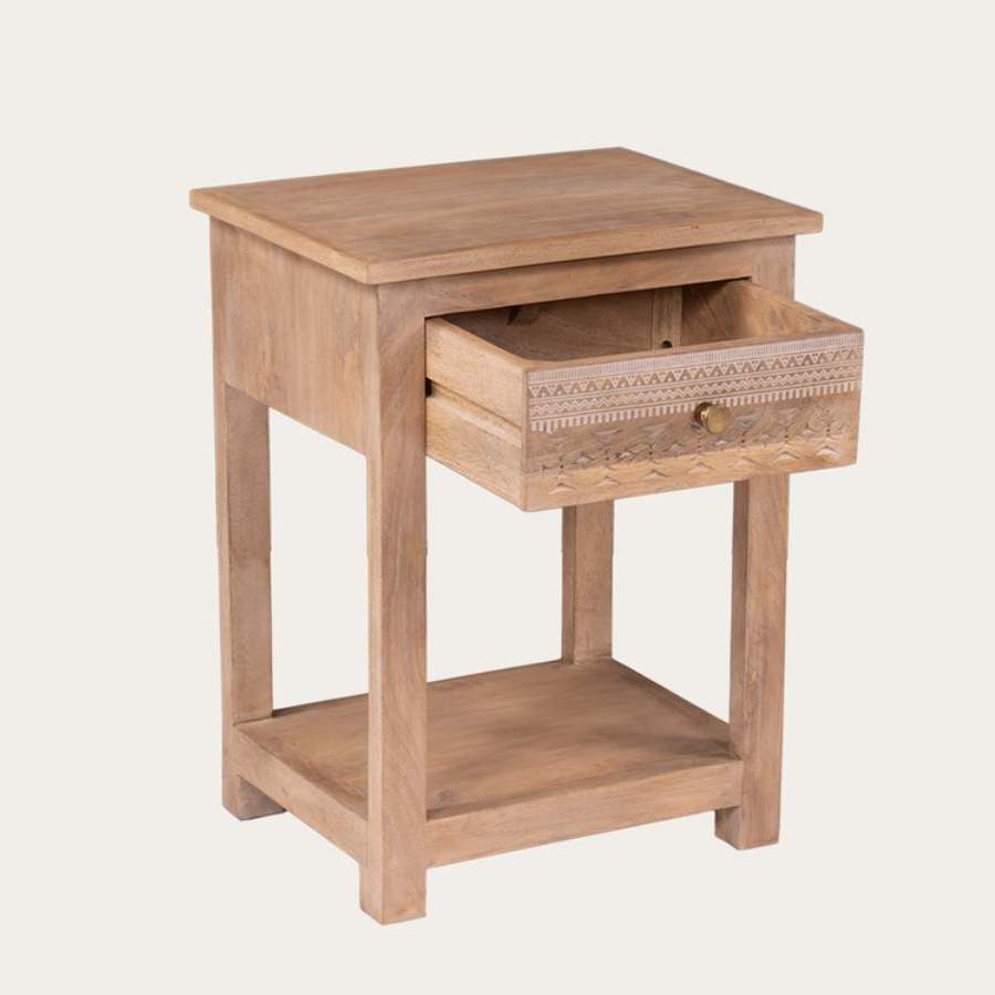 Coqueta mesita de noche fabricada en madera maciza de mango. Destaca por su frontal tallado a mano que le aporta textura y personalidad. Su cajón ofrece práctico almacenamiento, mientras el acabado resalta las vetas naturales. Una pieza artesanal de aire exótico que combina calidez y funcionalidad.