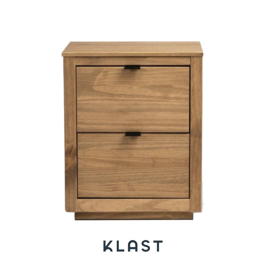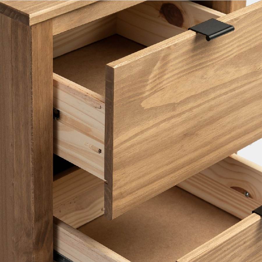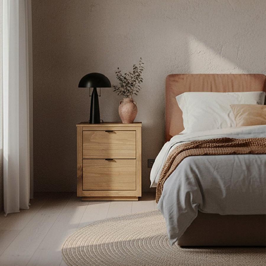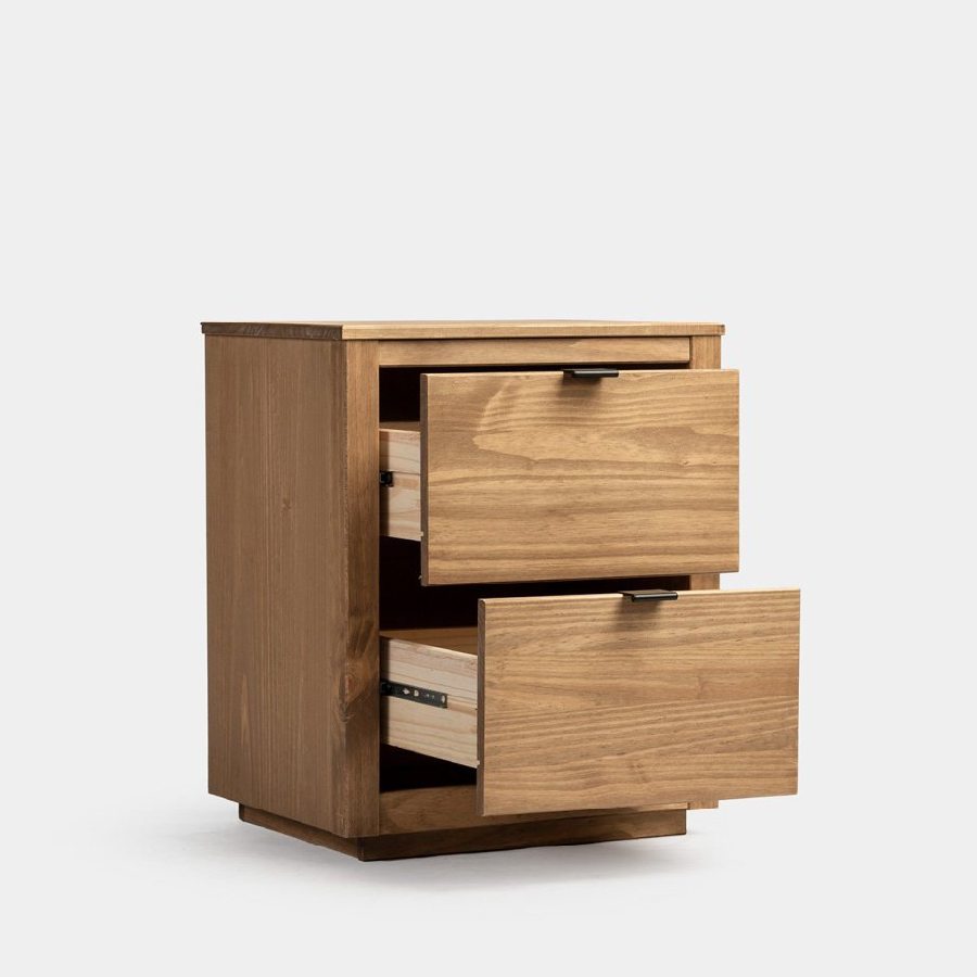 Mesita de noche con dos cajones, fabricada en madera maciza de araucaria en tono natural. Sus tiradores en negro añaden elegancia, mientras que la veta y textura de la madera ofrecen un carácter artesano.