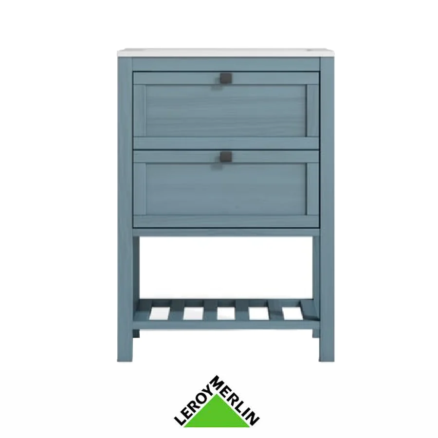 Mueble de lavabo pequeño de madera de pino macizo con cajones en color azul. Fabricado en España.