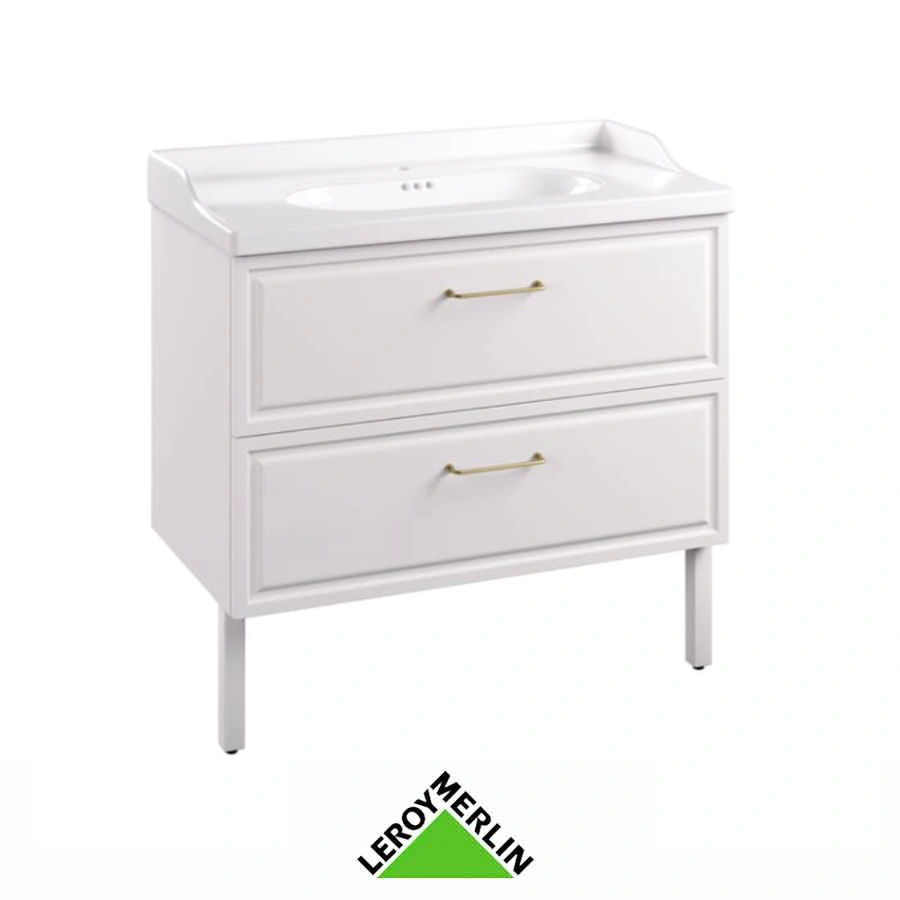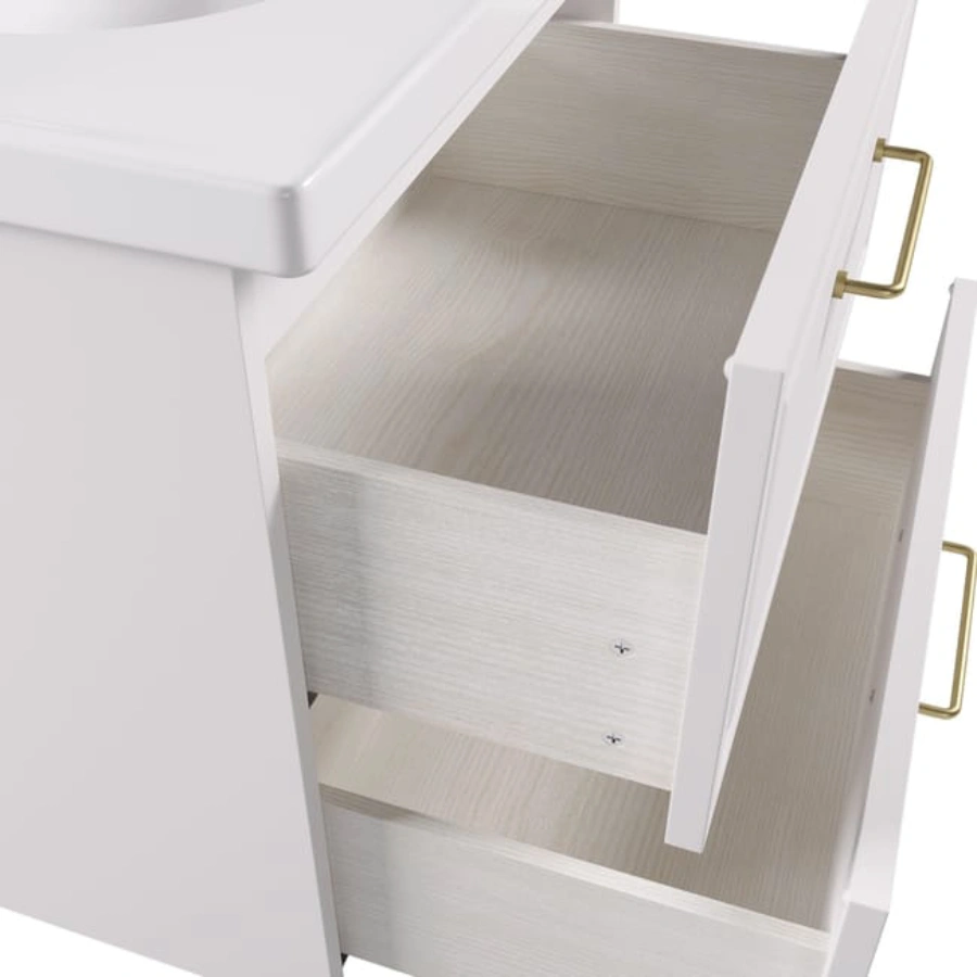 Mueble de lavabo de madera y aglomerado en acabado blanco mate con dos cajones que dispone de cierre amortiguado. No incluye grifería.