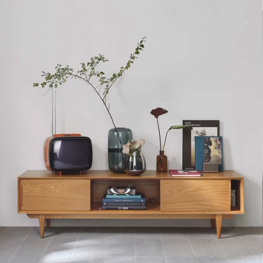 Mueble bajo de TV o multimedia de estilo retro y diseño de los años 50. Cuenta con un hueco central y dos compartimentos cerrados de puertas correderas.