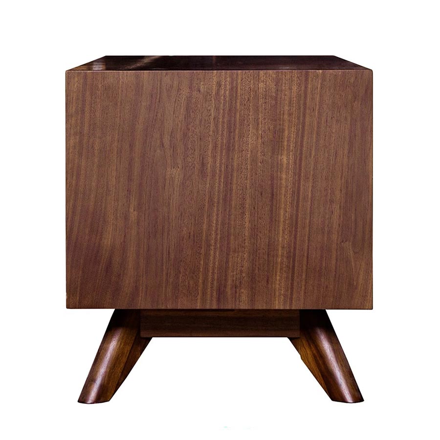Mueble de TV de aire retro años 50, hecho con una combinación de chapa de madera de nogal y MDF, y formado por una puerta , un cajón y un espacio.