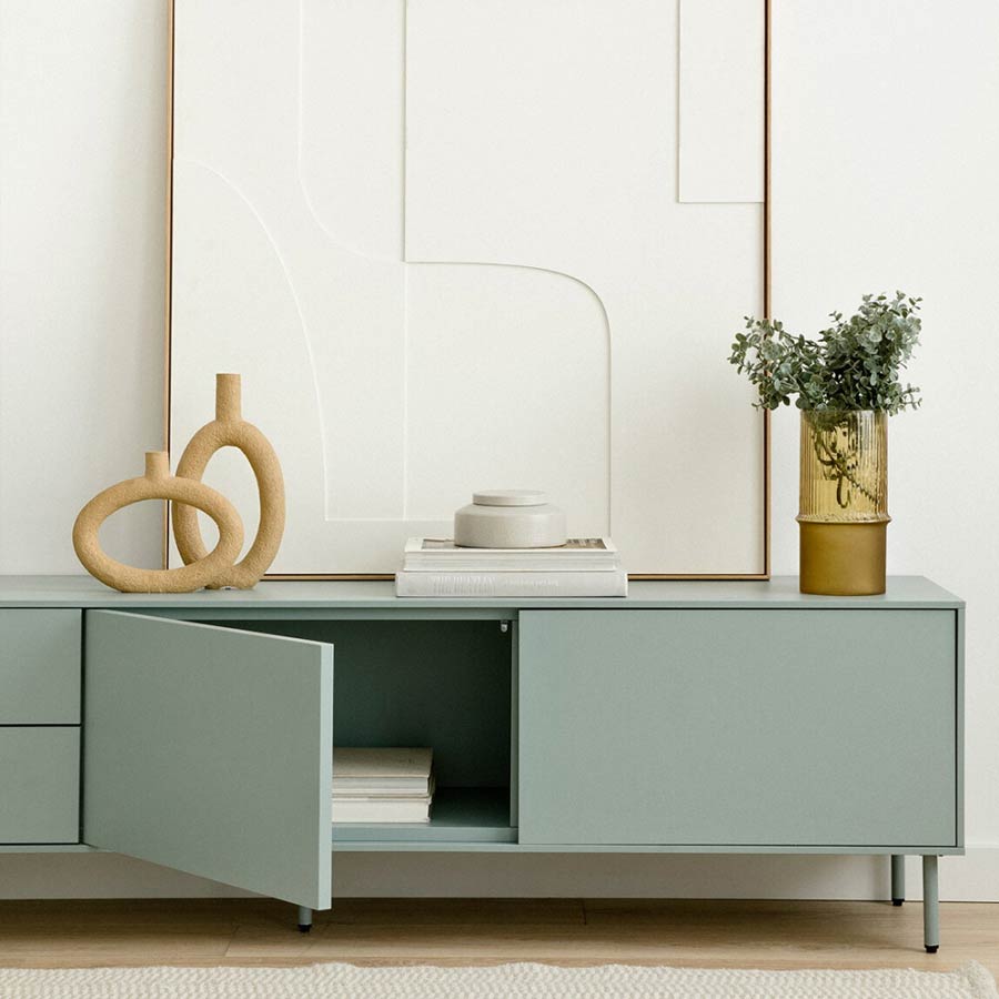 Bonito mueble de televisión con un diseño de líneas sencillas en color verde y formado por un módulo con dos amplios cajones con sistema de apertura push y dos puertas