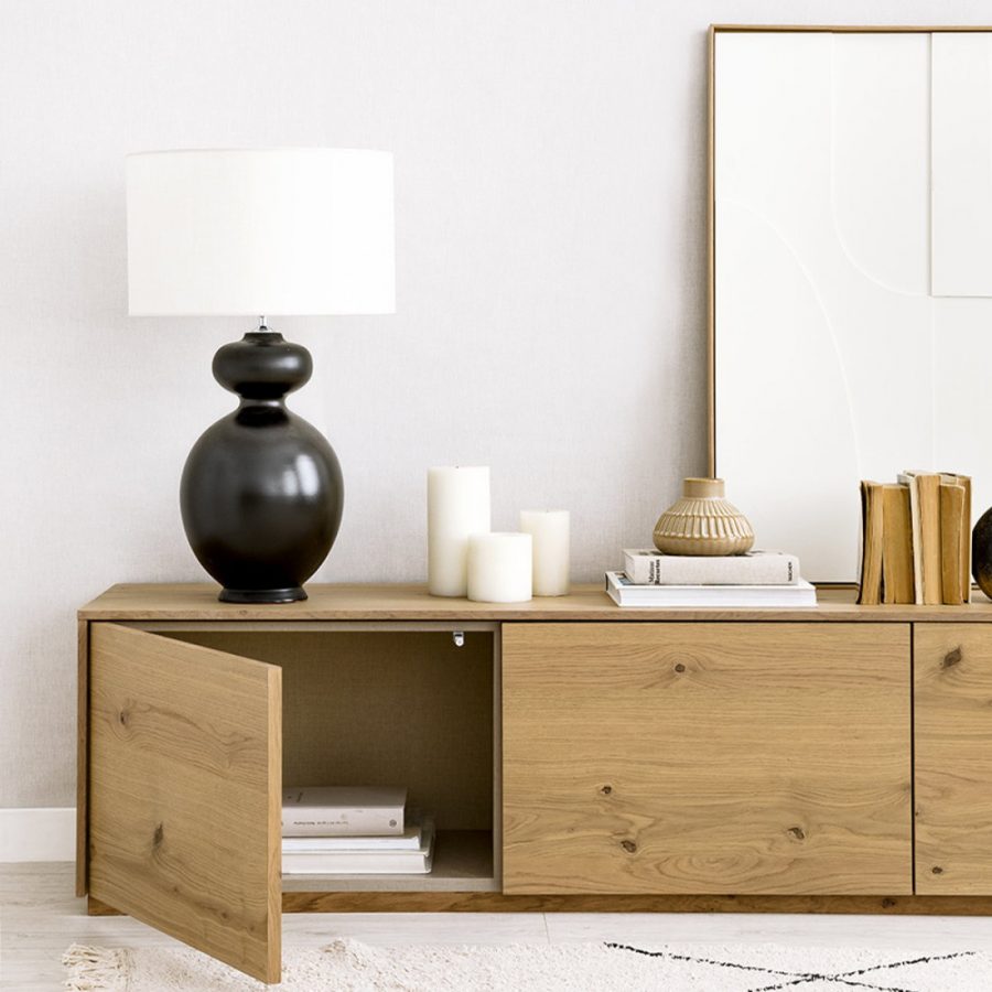 Mueble de TV o multimedia de sencillo diseño fabricado en chapa de roble nudoso. Formado por un módulo con 4 puertas con sistema de apertura push.
