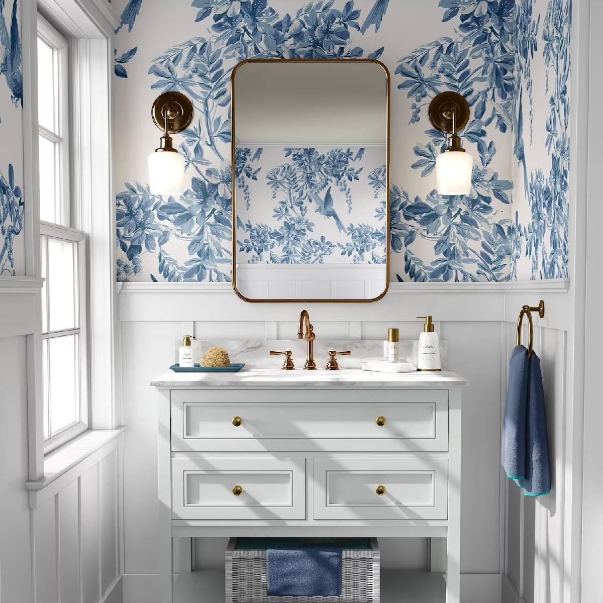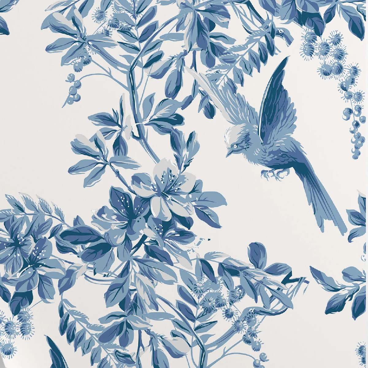 Papel pintado 100% ecológico con motivos florales en color azul, impreso en Italia con tintas al agua sobre 8 hojas de papel auténtico según la tradición del siglo XVIII.