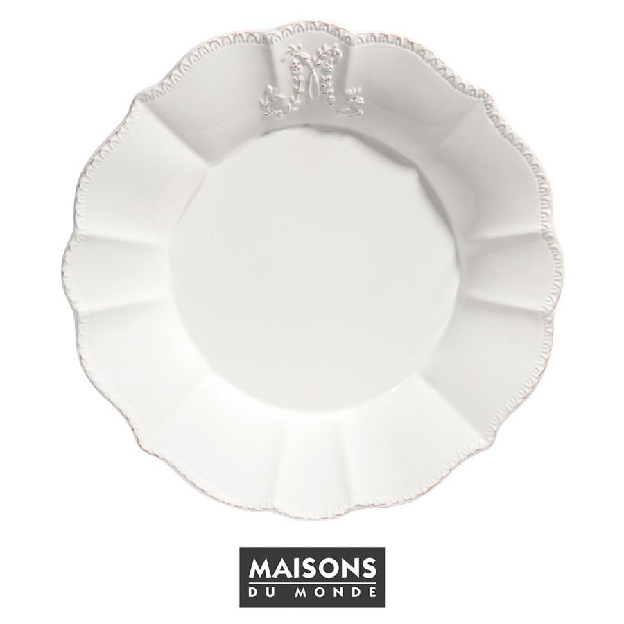 Plato llano de loza blanca de diseño clásico y estilo vintage. Con un pequeño monograma y borde en relieve.