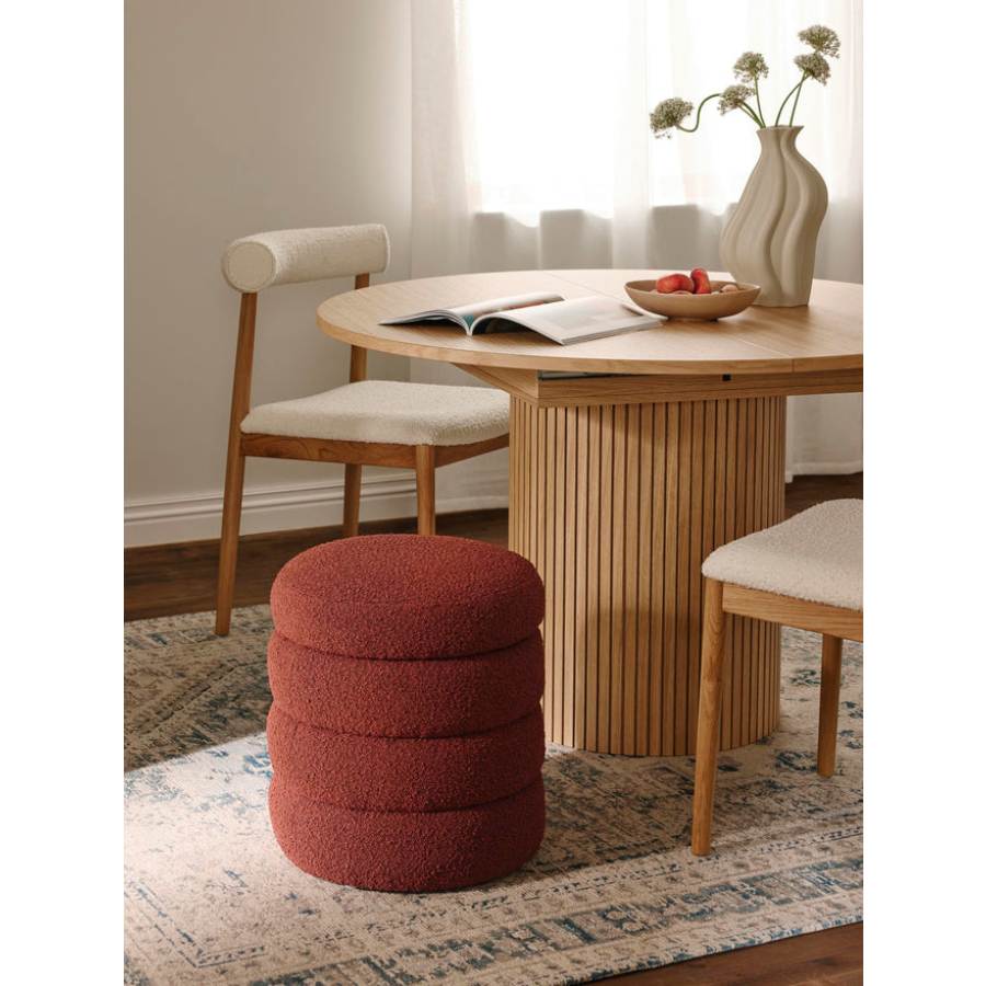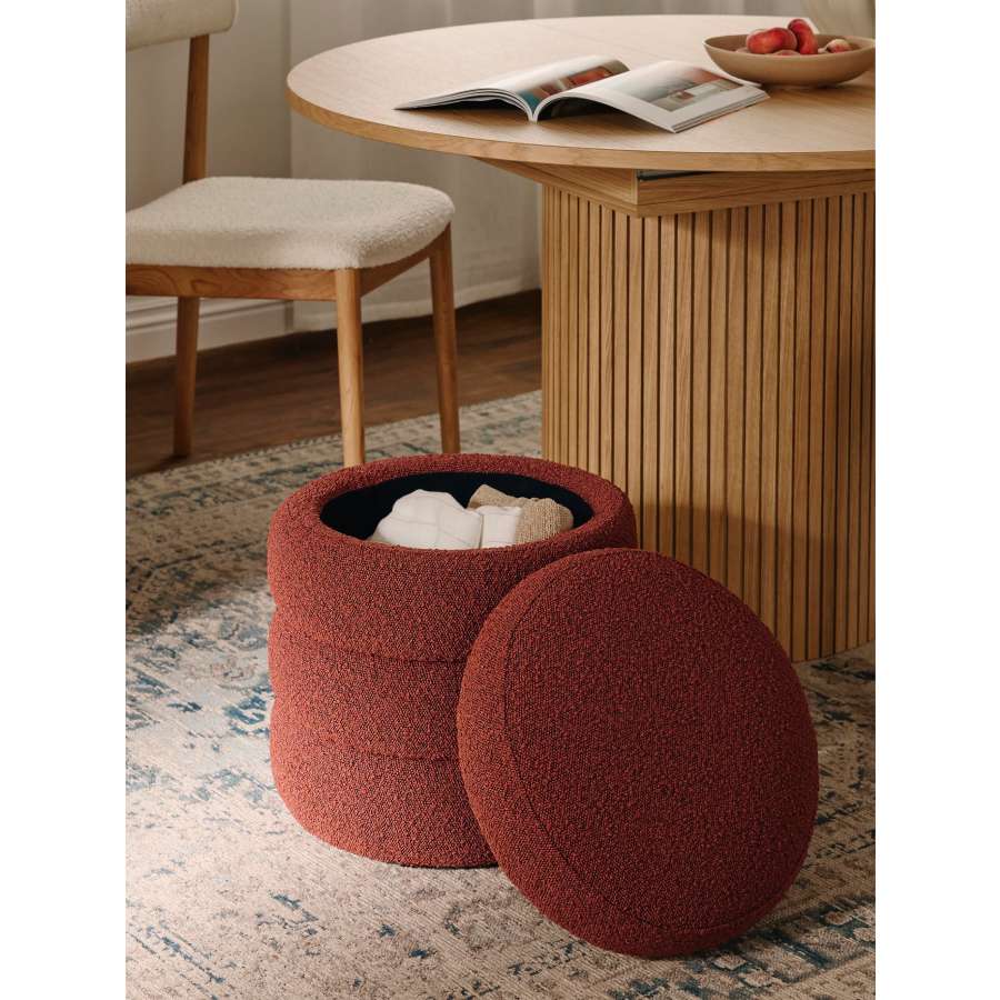 Puf tapizado con borreguillo rojo con espacio de almacenamiento debajo del asiento.