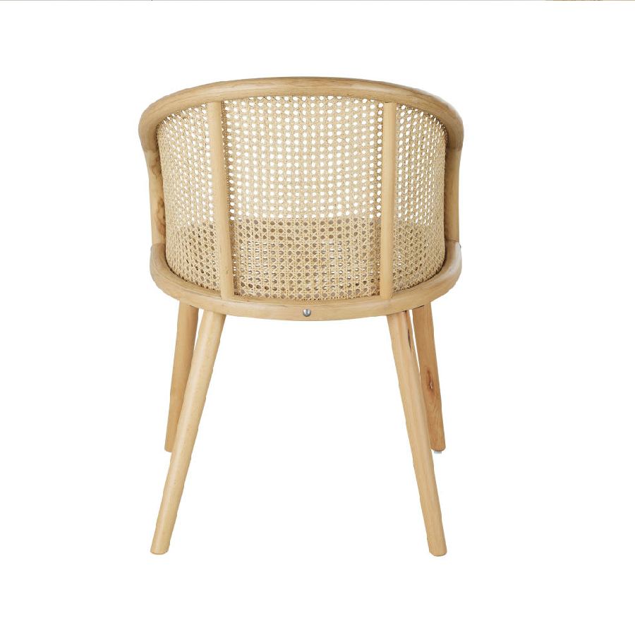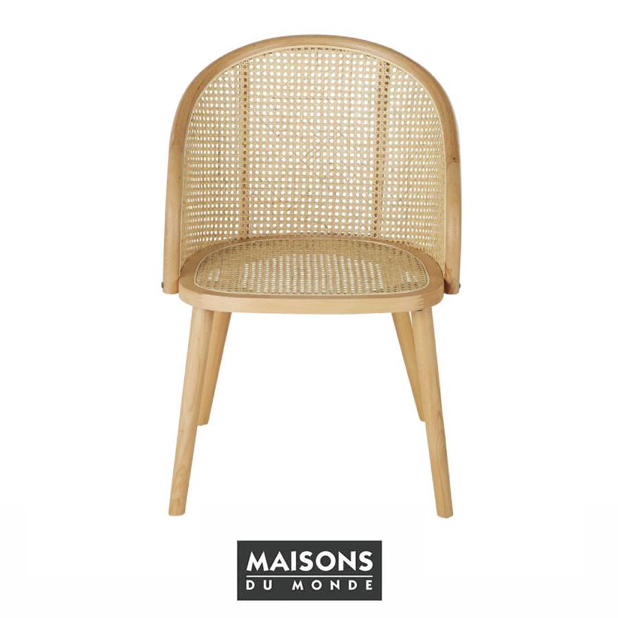Coqueta silla de comedor de inspiración vintage con estructura de madera con asiento y respaldo de rejilla de mimbre.