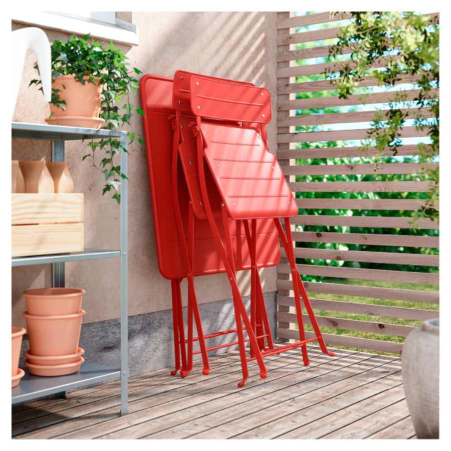 Silla de exterior de acero con revestimiento en polvo rojo intenso. Perfecta para tu balcón y otros espacios pequeños, ya que es plegable y se puede guardar fácilmente.