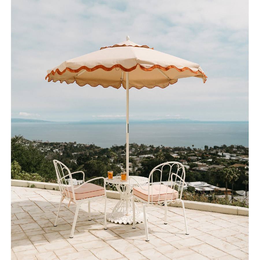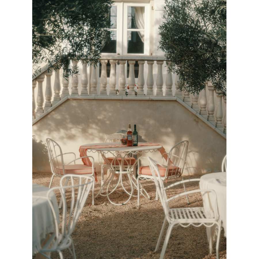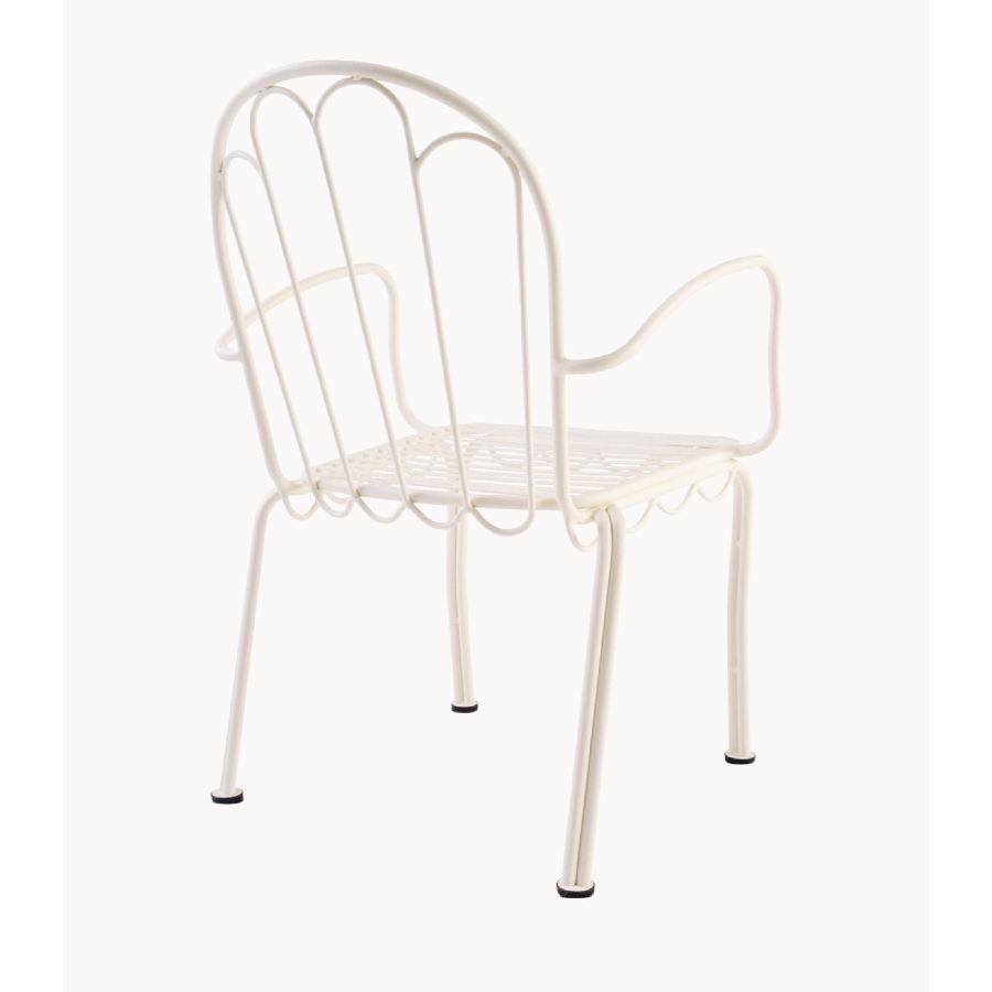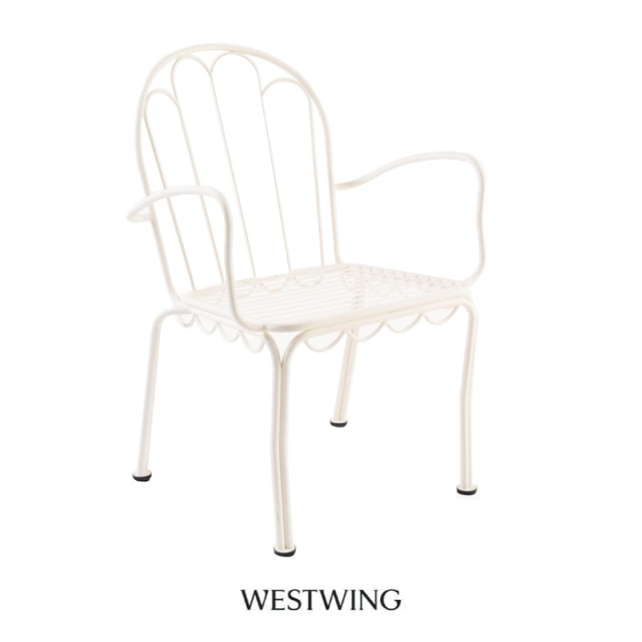 Maravillosa silla de jardín de metal, de líneas curvas y respaldo decorativo que combina la elegancia atemporal con un toque mediterráneo.