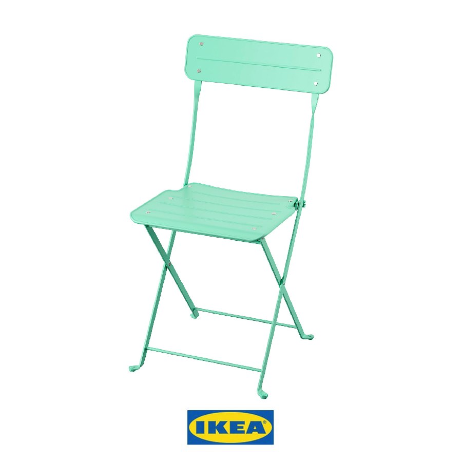 Silla de exterior de acero con revestimiento en polvo verde menta. Perfecta para tu balcón y otros espacios pequeños, ya que es plegable y se puede guardar fácilmente.