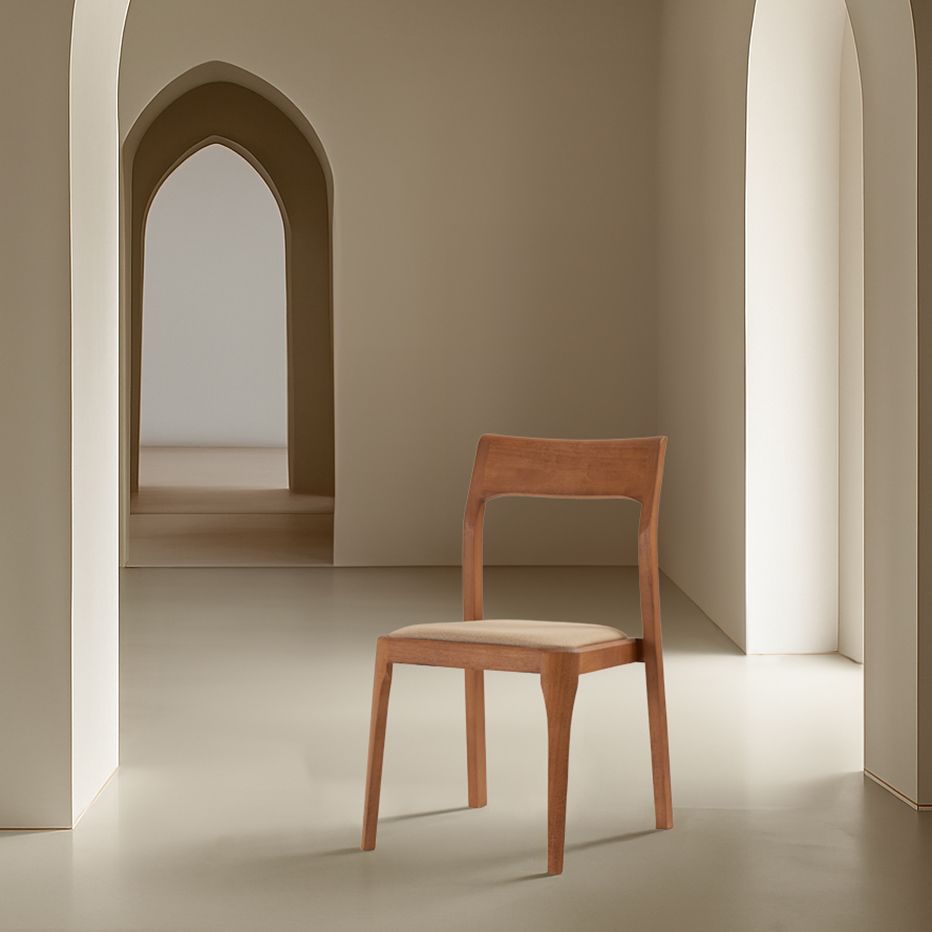 Elegante silla de fabricación artesanal, con estructura sólida de madera maciza de hevea y asiento tapizado en un suave tono beige.