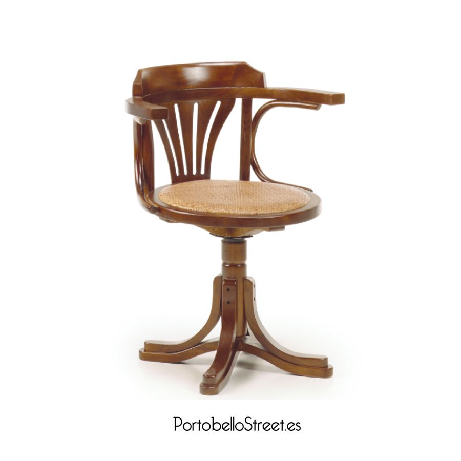 Silla giratoria con reposabrazos de estilo colonial fabricada a mano, con estructura de madera maciza y asiento de ratán.
