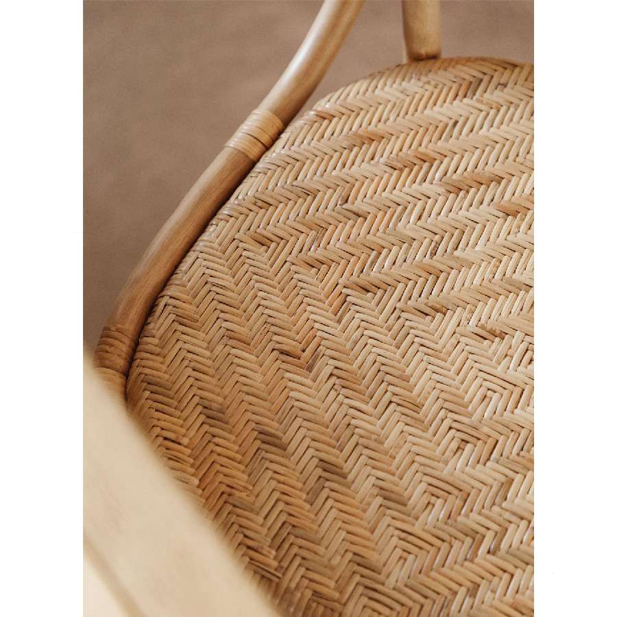 Preciosa y cómoda silla de comedor de ratán natural con acabado barnizado. Aportará calidez en cualquier ambiente y es perfecta para complementar tu comedor con un aire bohemio y rústico.