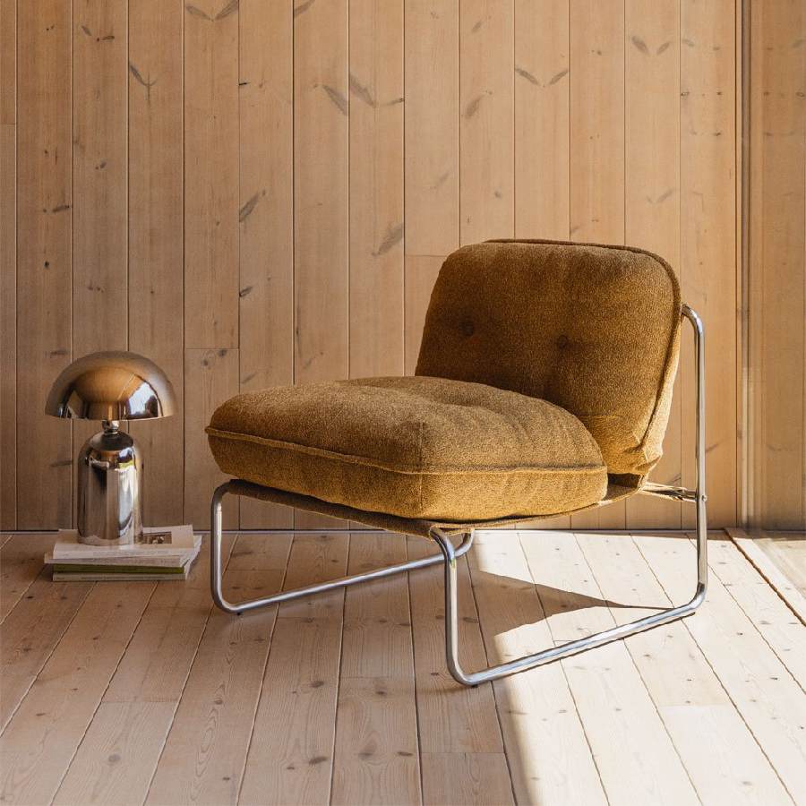 Sillón de diseño vanguardista tapizado en tela bouclé amarillo miel con estructura de hierro con acabado cromado. El respaldo y el asiento lo forman dos amplios cojines.