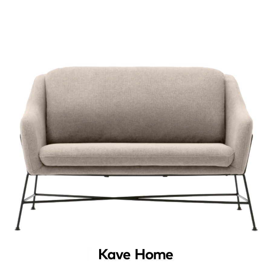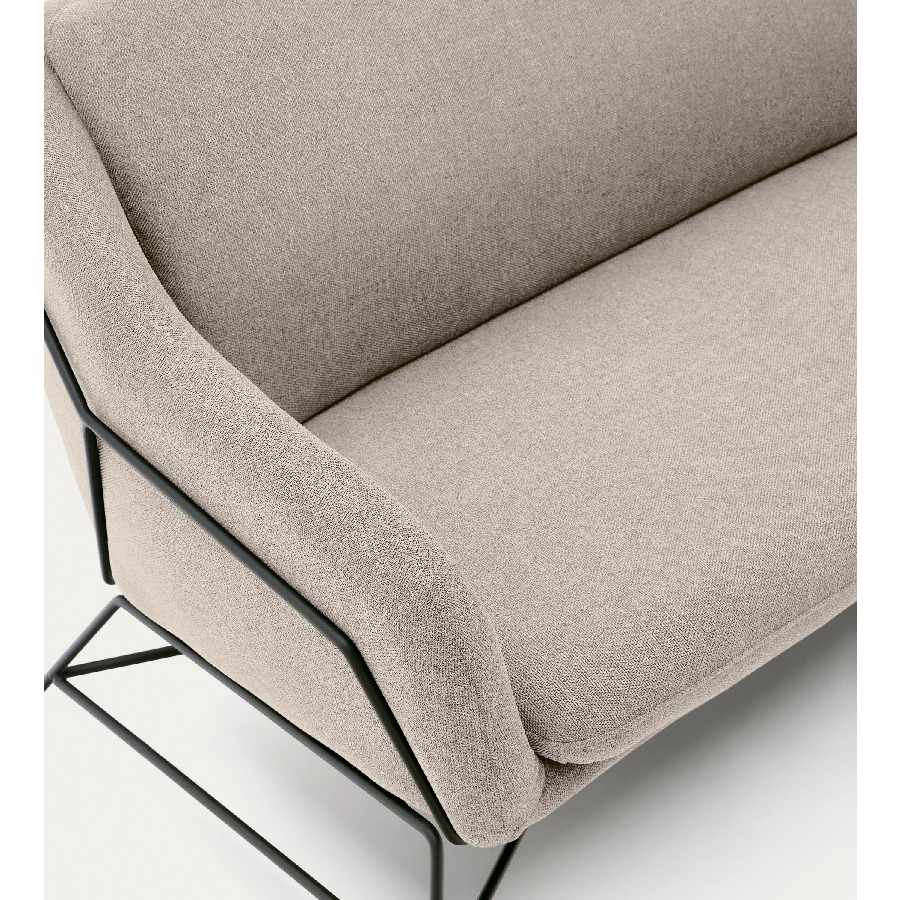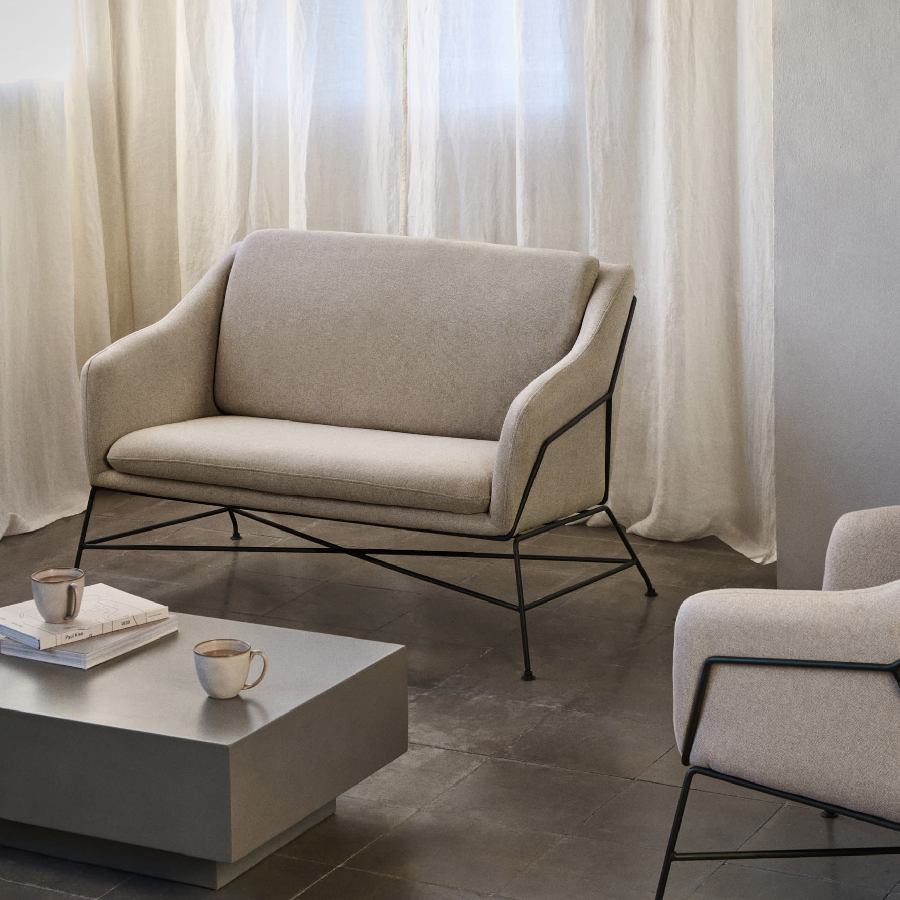 Sofá de 2 plazas de diseño contemporáneo tapizado en gris oscuro con reposabrazos. Su estructura exterior de acero sobre el asiento es un diseño de última tendencia.