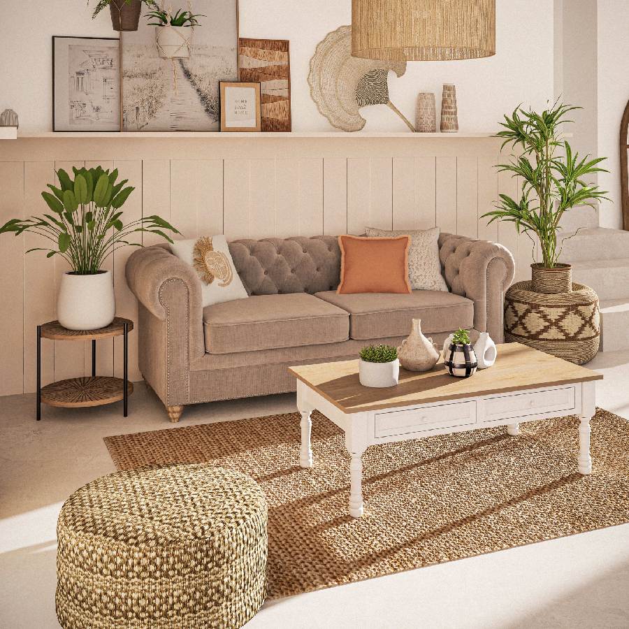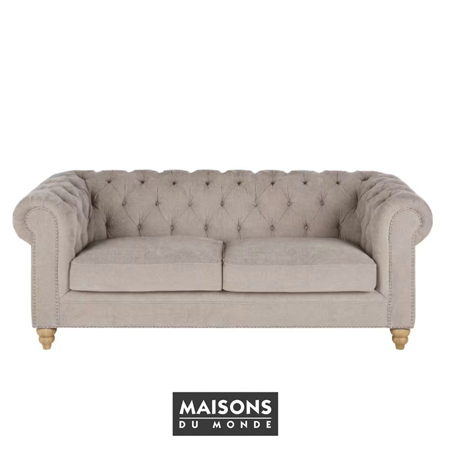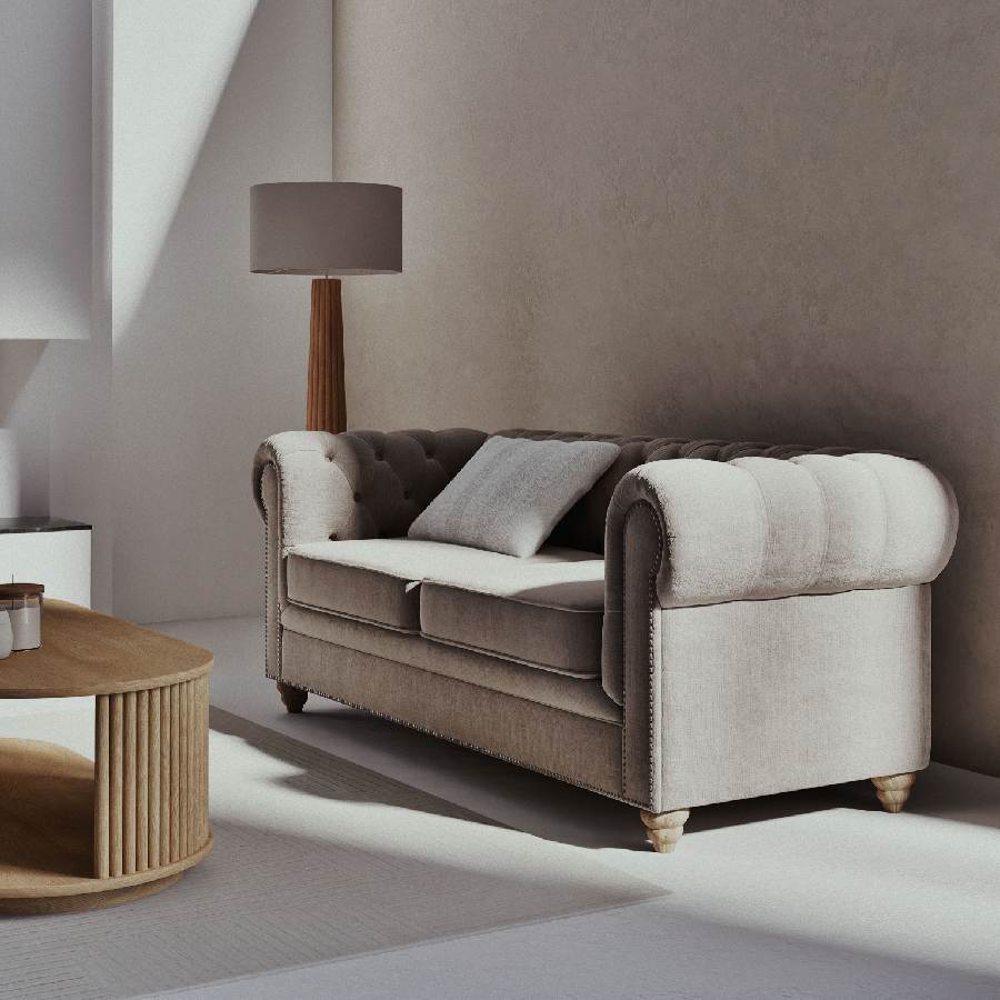 Descubre el encanto elegante de este sofá Chesterfield de 3-4 plazas en un suave terciopelo beige rosado.