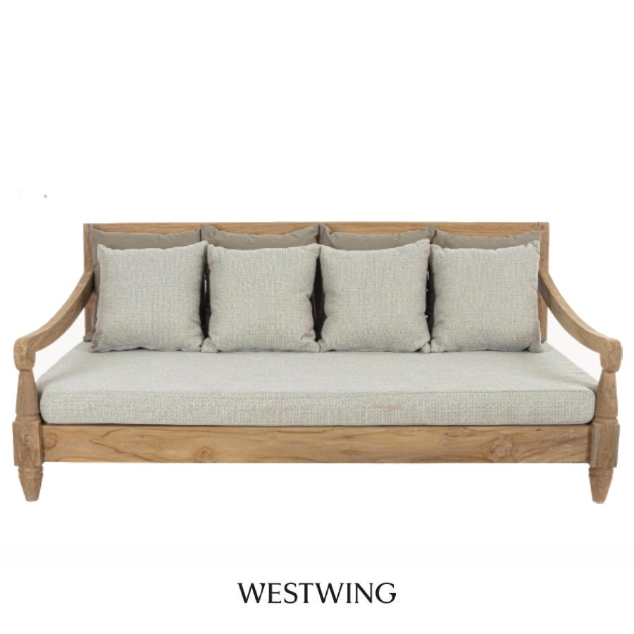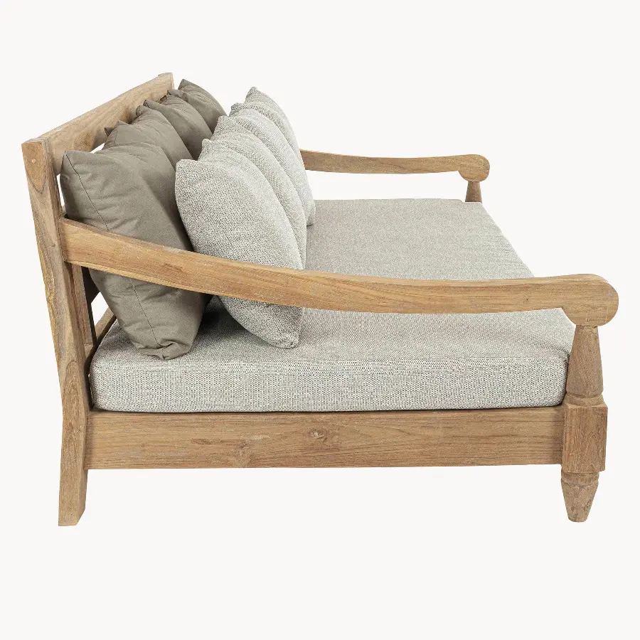 Un imponente sofá de 4 plazas con estructura de madera maciza de teca y cojines con fundas 100% poliéster con protección contra rayos UV, repelente a la suciedad y con relleno de espuma de secado rápido. Adecuado para su uso en exteriores.
