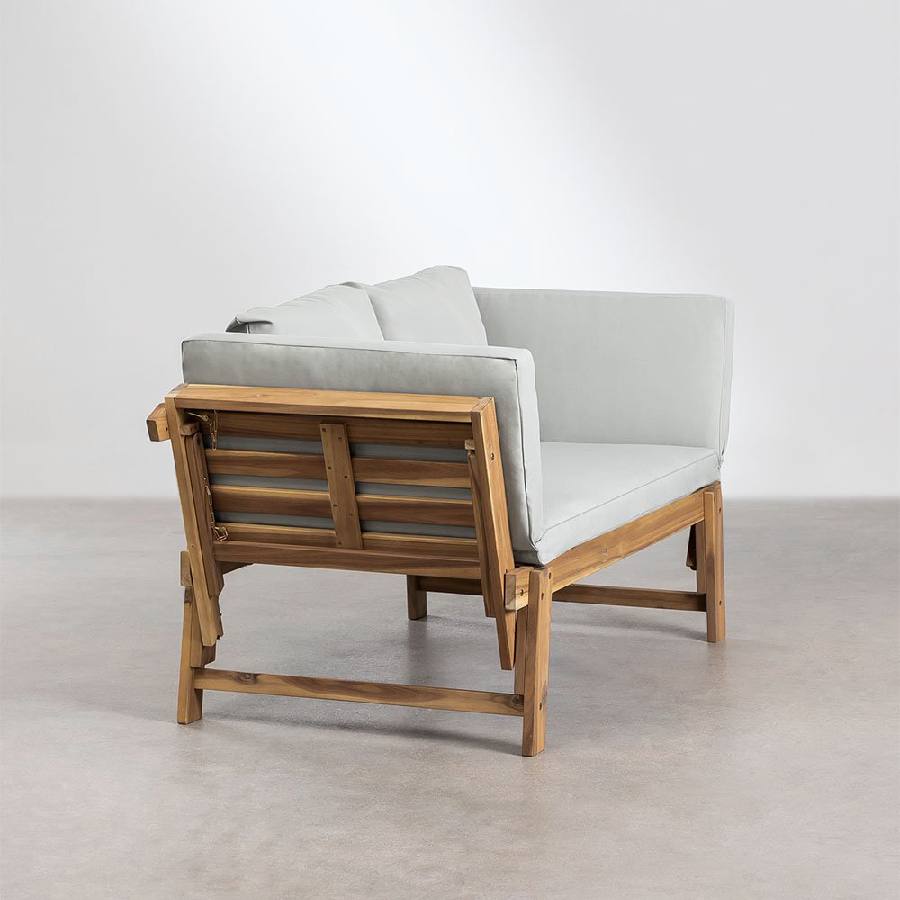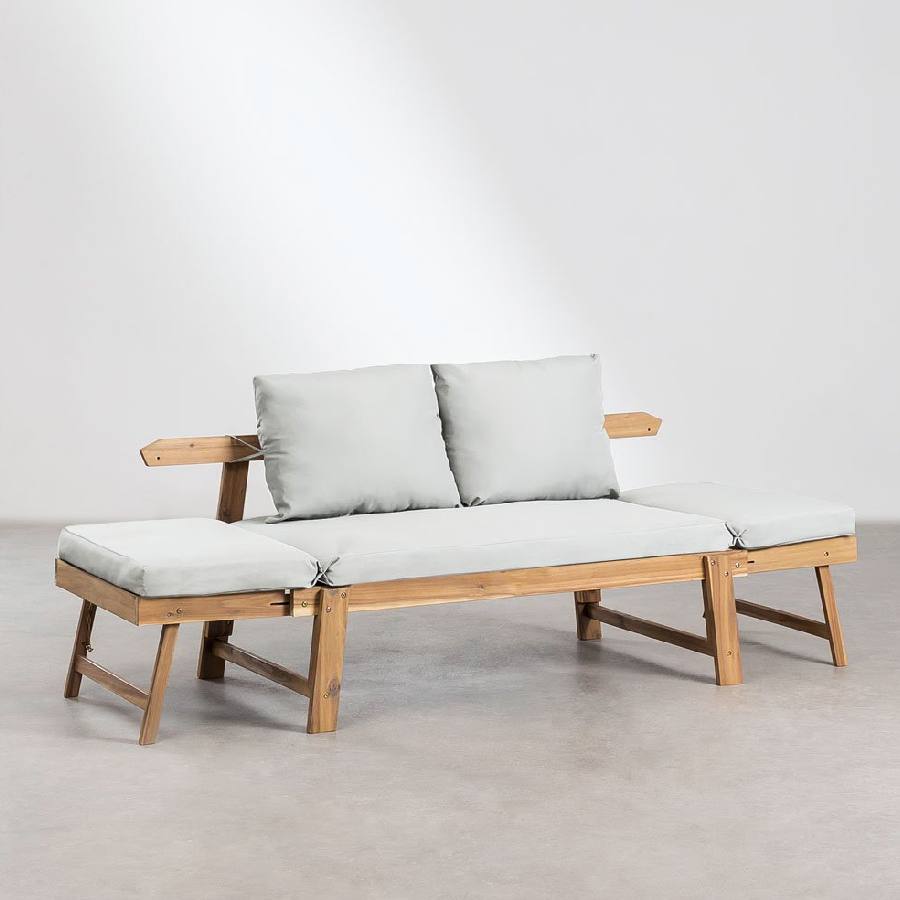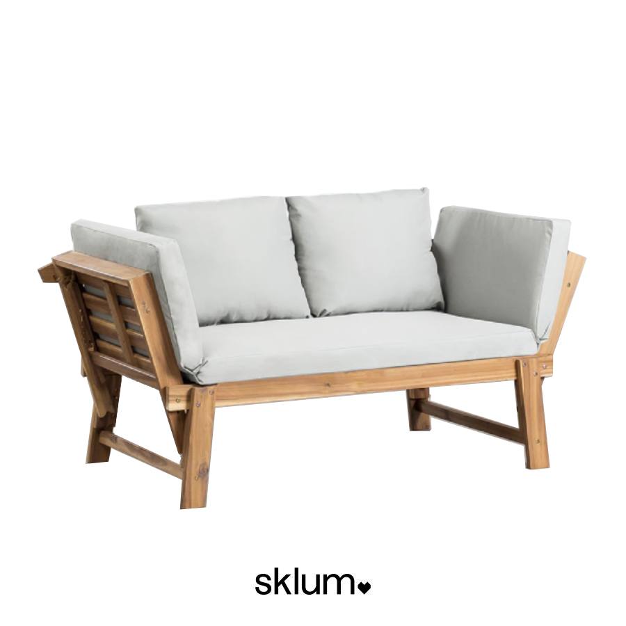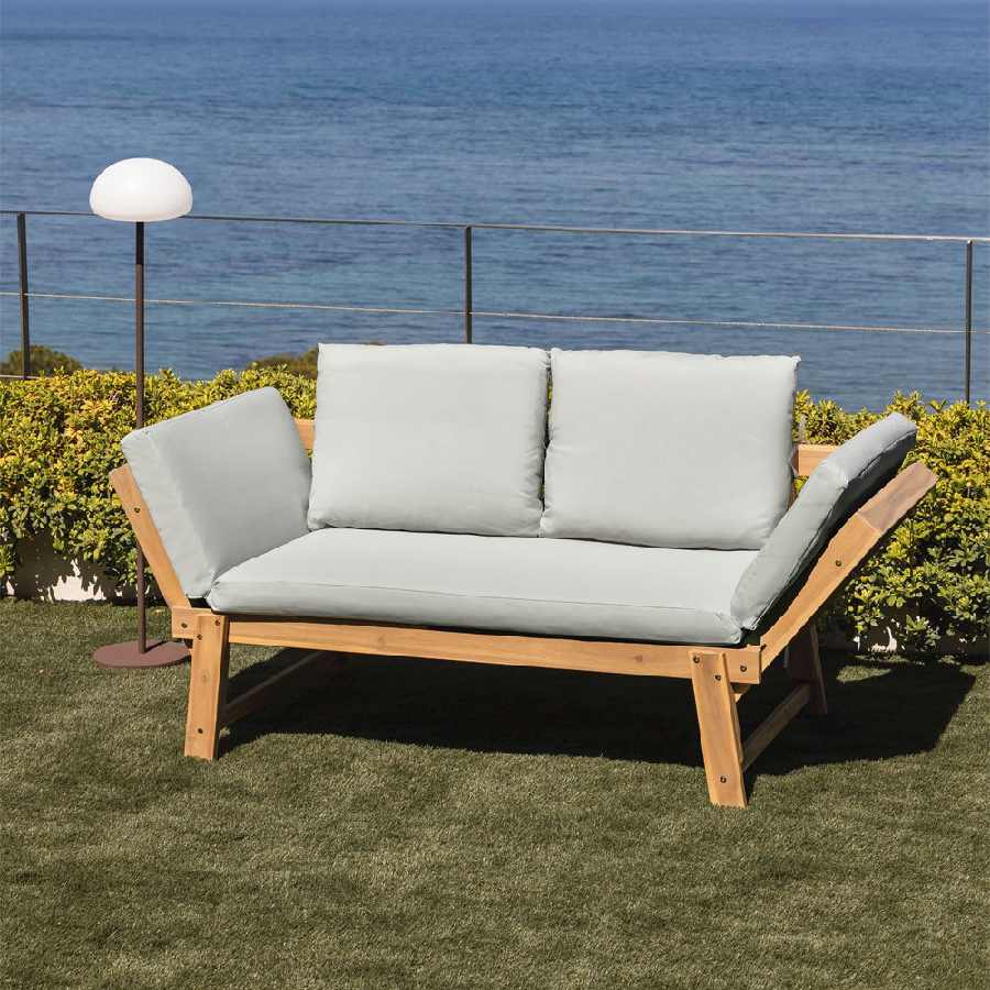 Sofá de jardín de 3 plazas de madera de acacia que se convierte fácilmente en una tumbona. Con acabado de tinte a base de aceite para su protección. Incluye mullidos cojines de color gris desenfundables con cremallera.