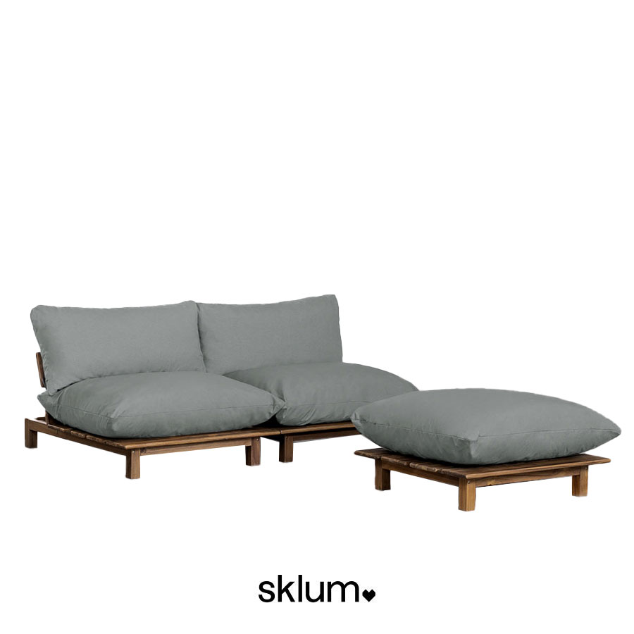 Conjunto de sofá de exterior modular reclinable formado por 2 piezas y un puff. La estructura está fabricada en madera de acacia y los cojines del respaldo y el asiento están compuestos de una funda desenfundable de poliéster y rellenos de polifibras y espuma.