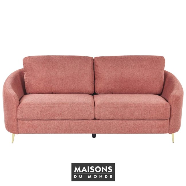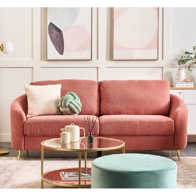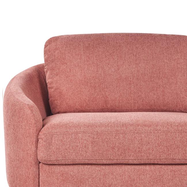 Confortable sofá rosa de diseño curvilíneo con acolchado grueso en el asiento.