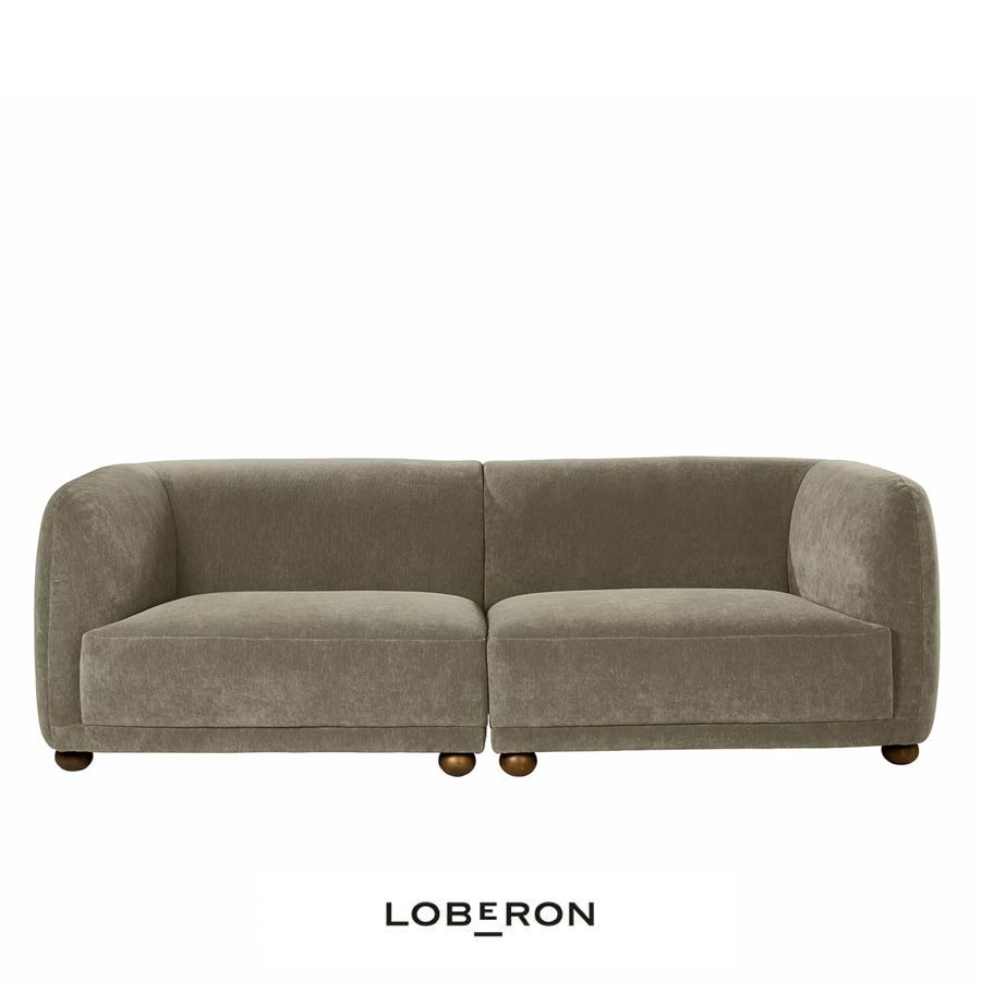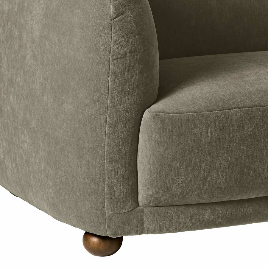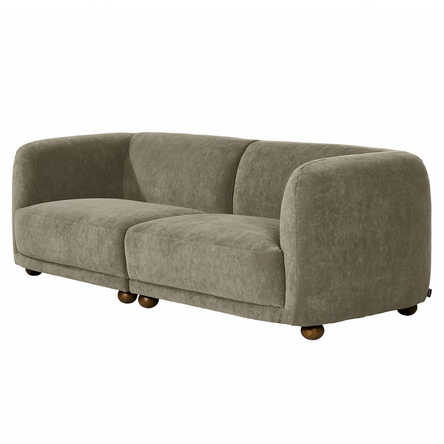 Elegante y confortable sofá de formas redondeadas y look contemporáneo. Con tapizado en tejido boucle de color verde oliva. Incluye cuatro cojines.