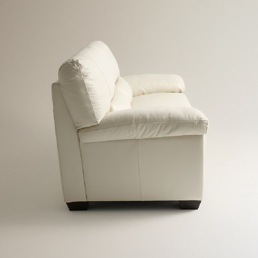 Sofá de 3 plazas con reposabrazos de diseño moderno, tapizado en una suave piel de vacuno en color blanco. Los cojines no son desenfundables.
