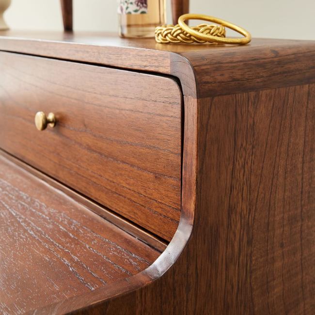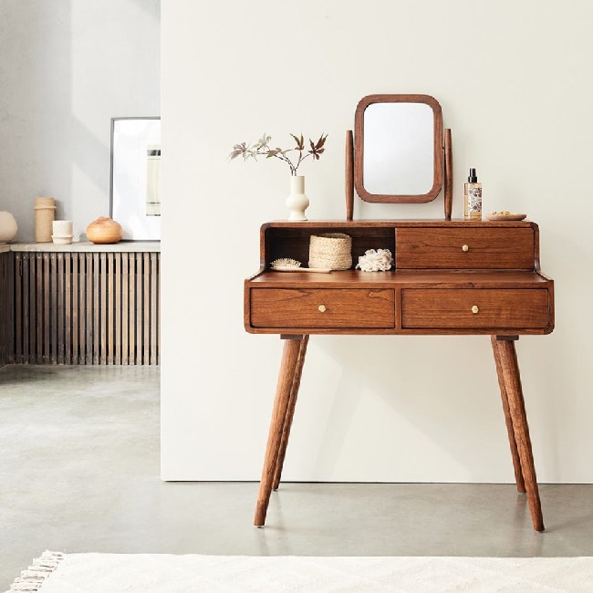 Precioso y elegante tocador de líneas redondeadas y estilo vintage, fabricado con madera de mindi con acabado nogal y que cuenta con espejo, tres cajones y un compartimento.