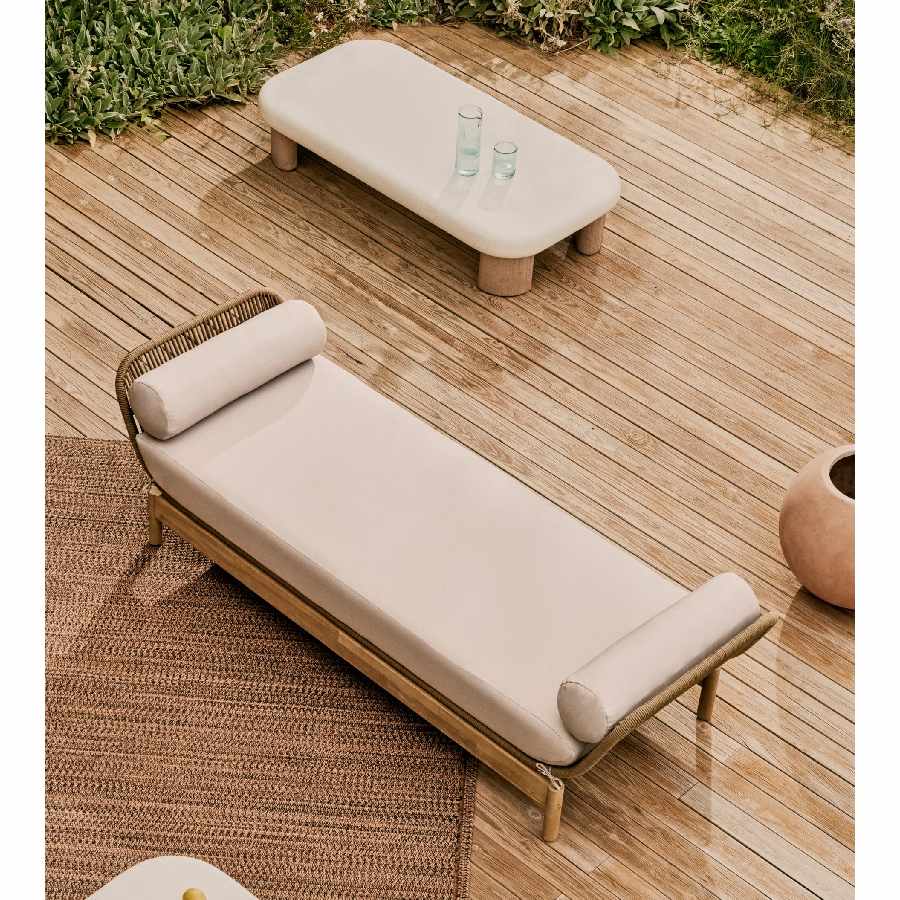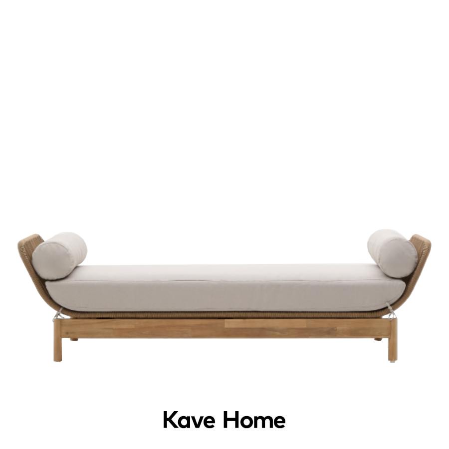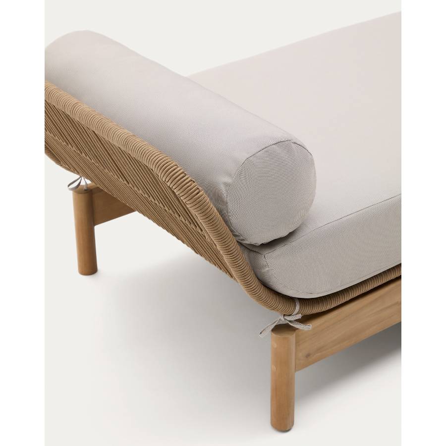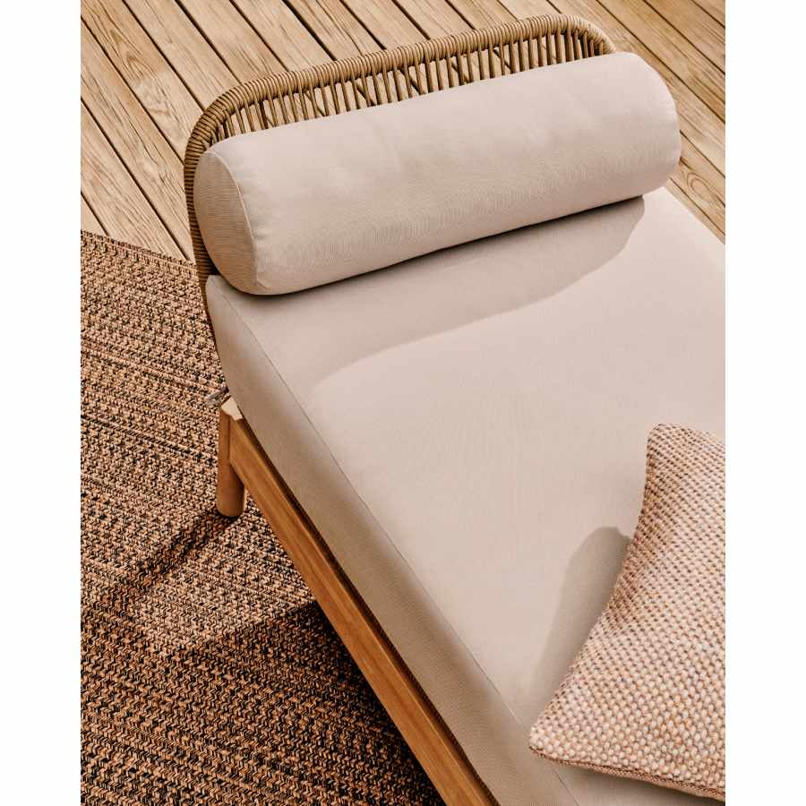 Elegante tumbona diván fabricada con madera maciza de acacia y cuerda sintética trenzada a mano. Incluye cojines de colchón y almohadas desenfundables. Es apta para interiores y exteriores, y resistente a los rayos UV.