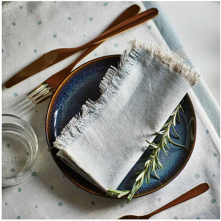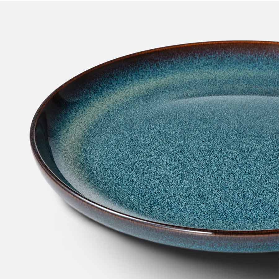 Vajilla vidriada de color azul océano con detalles en marrón dorado de 18 piezas: 6 platos llanos, 6 platos hondos y 6 platos de postre.