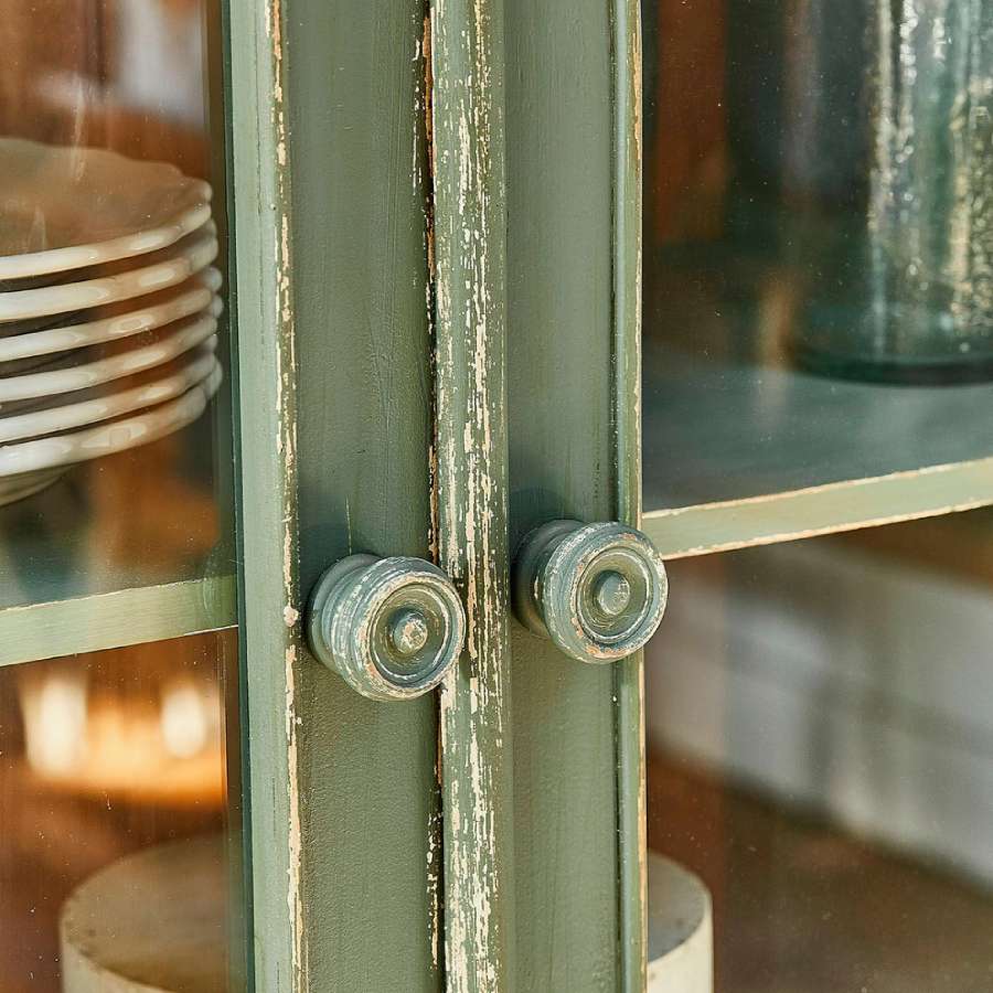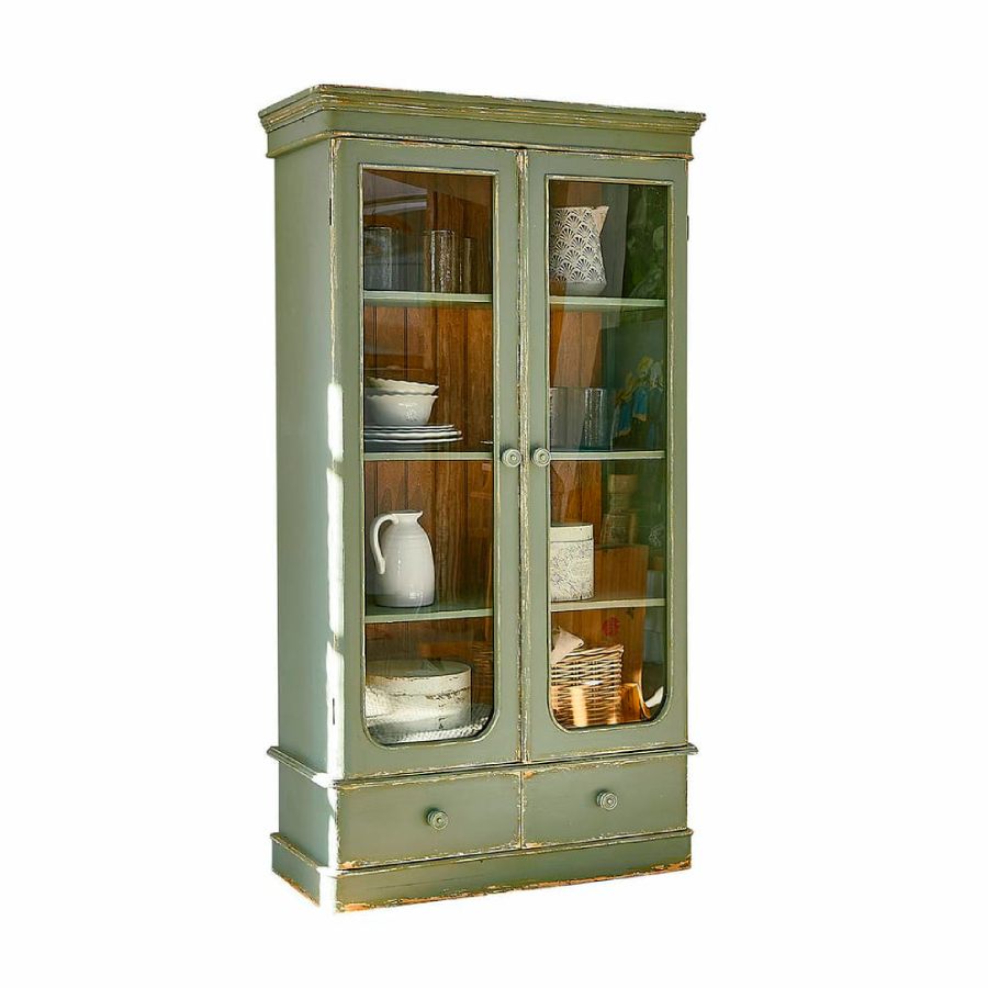 Encantadora vitrina verde con acabado envejecido, con dos cajones y dos puertas de cristal. Una bella pieza de mobiliario vintage que combina funcionalidad y estética atemporal.