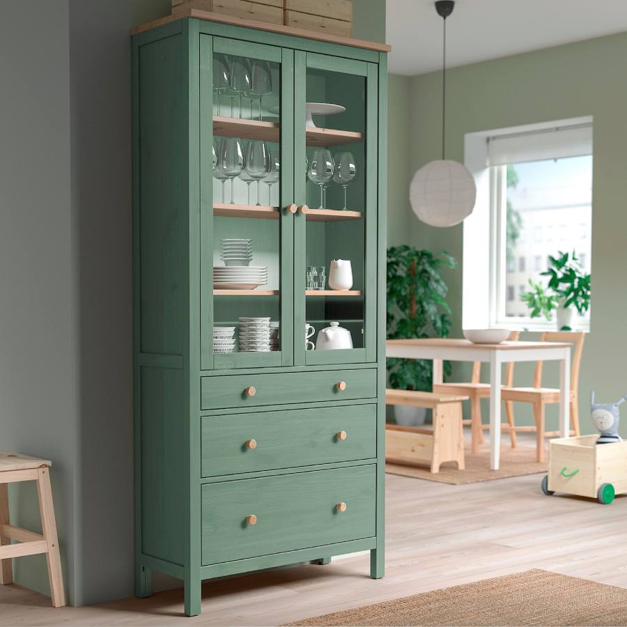 Vitrina de madera maciza de pino con 3 cajones y 3 baldas, en color verde grisáceo.